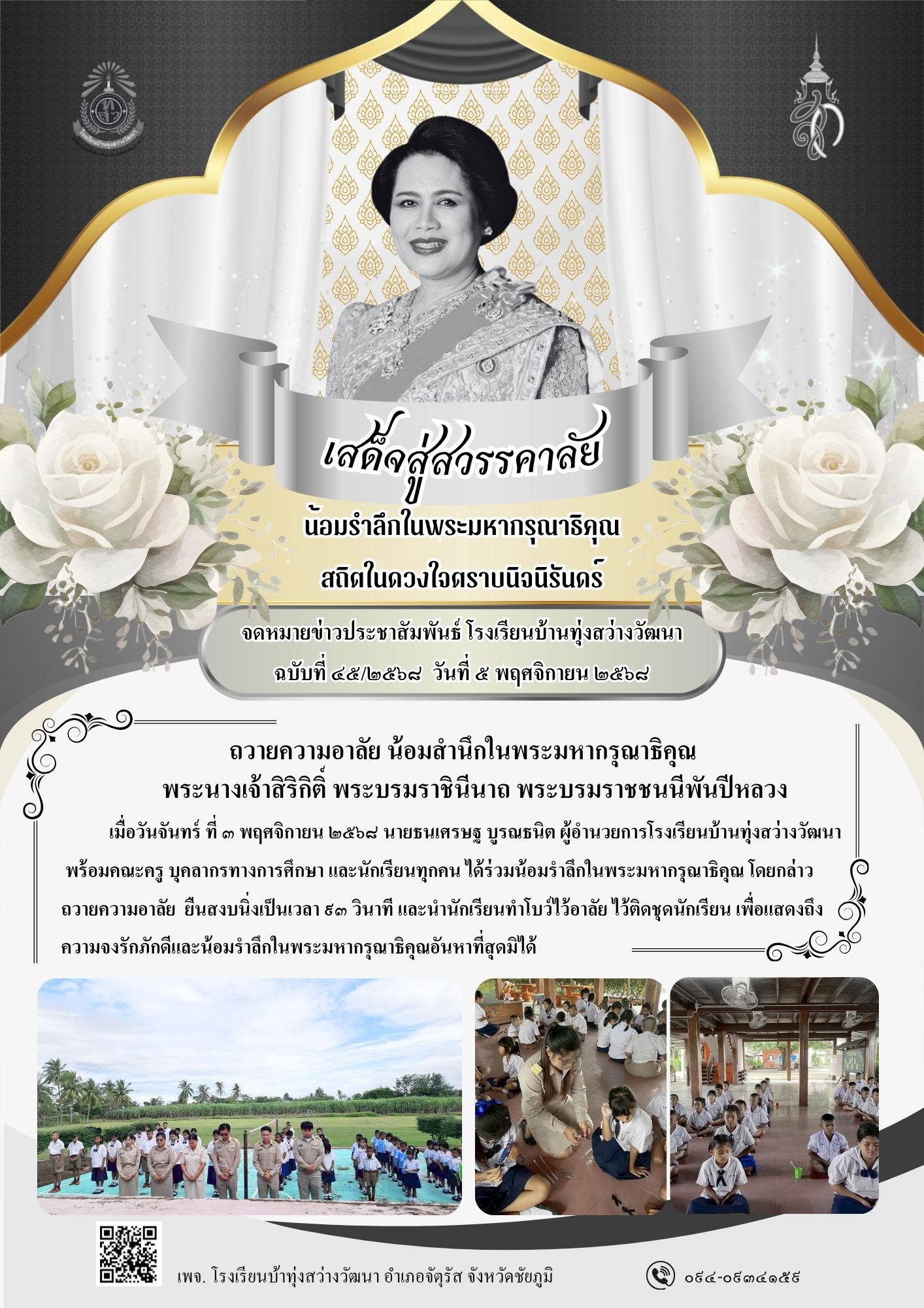 | 2 | เมื่อวันจันทร์ ที่ ๓ พฤศจิกายน ๒๕๖๘ นายธนเศรษฐ บูรณธนิต ผู้อำนวยการโรงเรียนบ้านทุ่งสว่างวัฒนา พร้อมคณะครู บุคลากรทางการศึกษา และนักเรียนทุกคน ได้ร่วมน้อมรำลึกในพระมหากรุณาธิคุณ โดยกล่าวถวายความอาลัย ยืนสงบนิ่งเป็นเวลา ๙๓ วินาที และนำนักเรียนทำโบว์ไว้อาลัย ไว้ติดชุดนักเรียน เพื่อแสดงถึงความจงรักภักดีและน้อมรำลึกในพระมหากรุณาธิคุณอันหาที่สุดมิได้ |