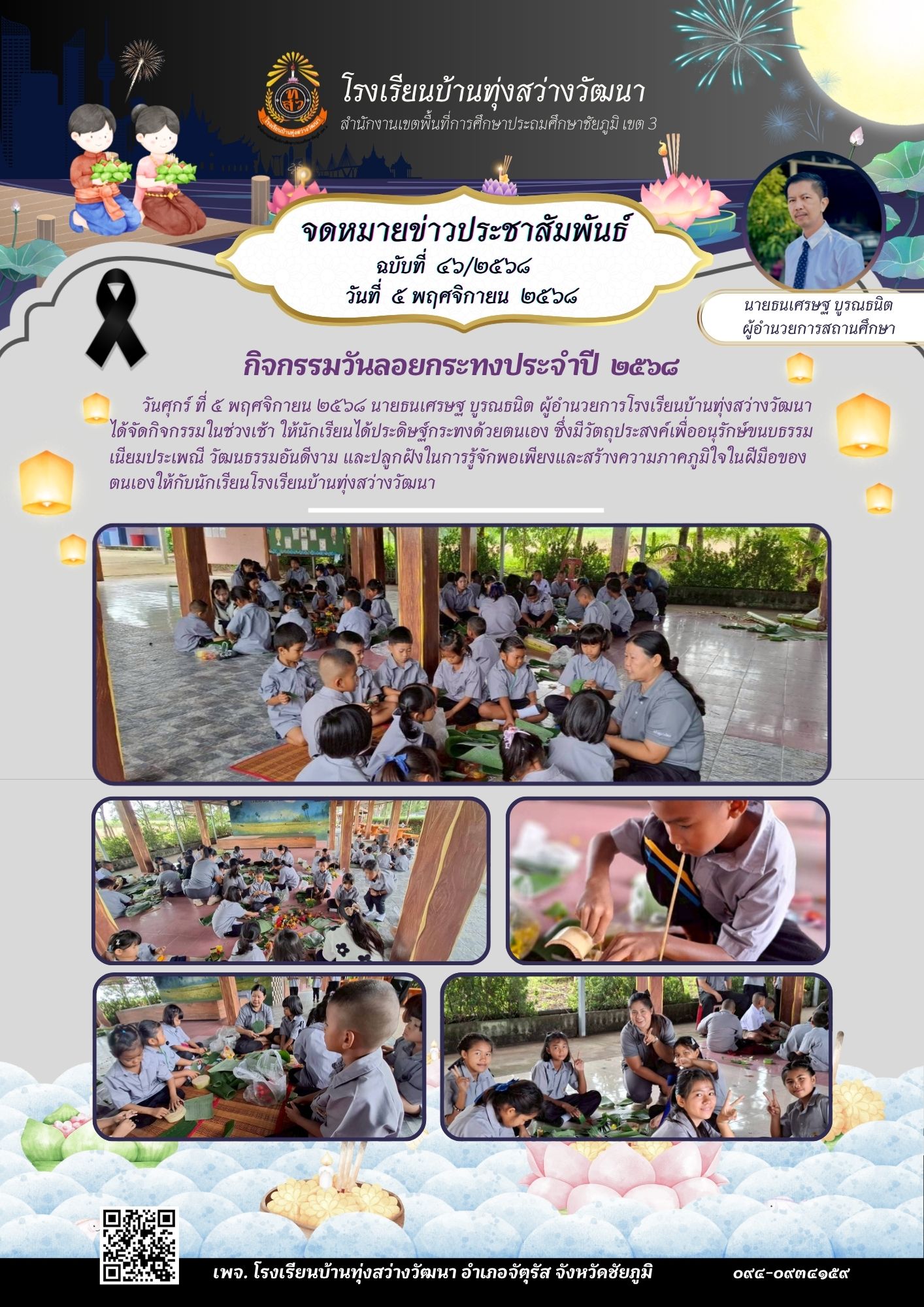 | 3 | วันศุกร์ ที่ ๕ พฤศจิกายน ๒๕๖๘ นายธนเศรษฐ บูรณธนิต ผู้อำนวยการโรงเรียนบ้านทุ่งสว่างวัฒนา ได้จัดกิจกรรมในช่วงเช้า ให้นักเรียนได้ประดิษฐ์กระทงด้วยตนเอง ซึ่งมีวัตถุประสงค์เพื่ออนุรักษ์ขนบธรรมเนียมประเพณี วัฒนธรรมอันดีงาม และปลูกฝังในการรู้จักพอเพียงและสร้างความภาคภูมิใจในฝีมือของ ตนเองให้กับนักเรียนโรงเรียนบ้านทุ่งสว่างวัฒนา |