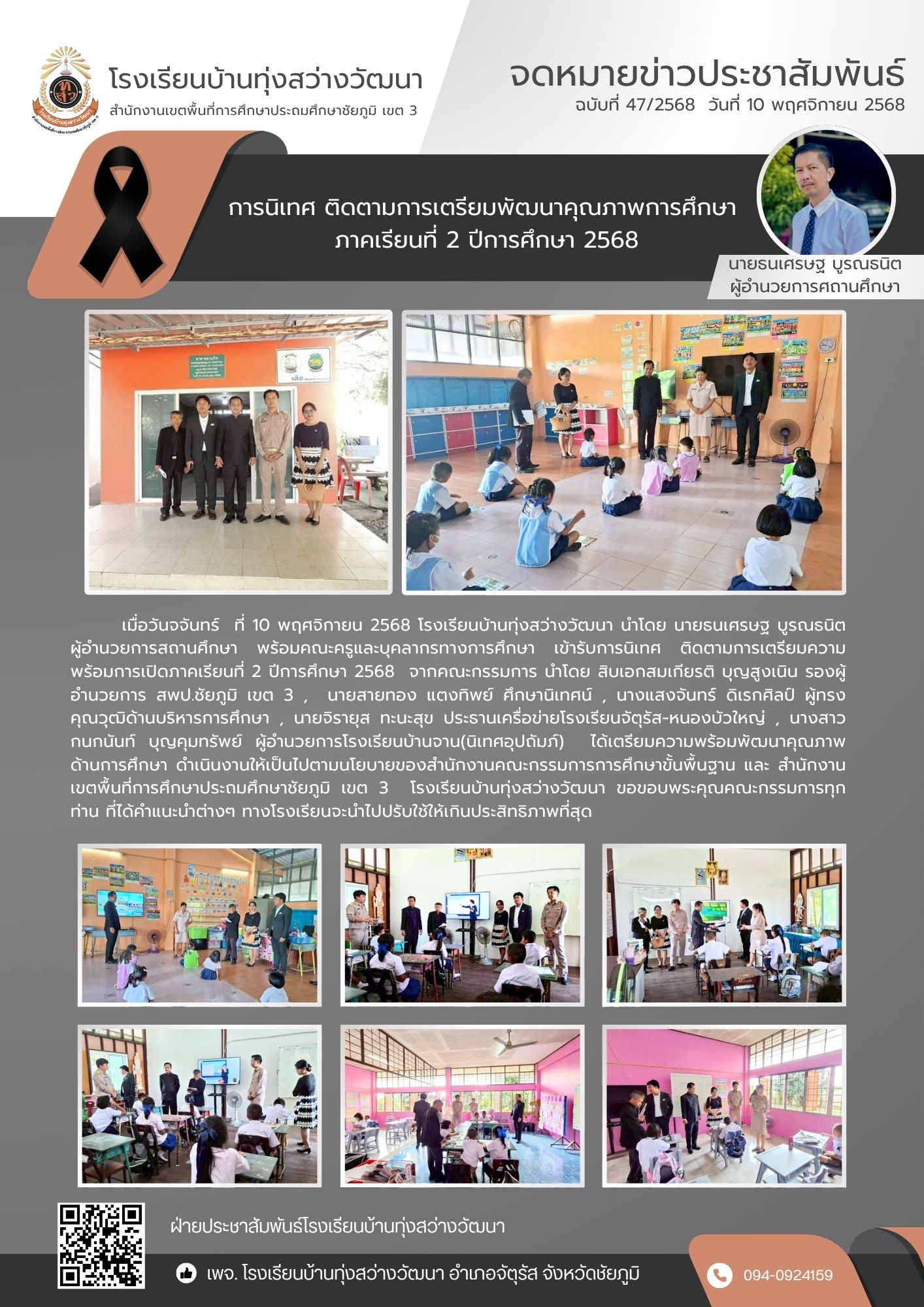 เมื่อวันจจันทร์ ที่ 10 พฤศจิกายน 2568 โรงเรียนบ้านทุ่งสว่างวัฒนา นำโดย นายธนเศรษฐ บูรณธนิต ผู้อำนวยการสถานศึกษา พร้อมคณะครูและบุคลากรทางการศึกษา เข้ารับการนิเทศ ติดตามการเตรียมความพร้อมการเปิดภาคเรียนที่ 2 ปีการศึกษา 2568 จากคณะกรรมการ นำโดย สิบเอกสมเกียรติ บุญสูงเนิน รองผู้อำนวยการ สพป.ชัยภูมิ เขต 3 , นายสายทอง แตงทิพย์ ศึกษานิเทศน์ , นางแสงจันทร์ ดิเรกศิลป์ ผู้ทรงคุณวุฒิด้านบริหารการศึกษา , นายจิรายุส ทะนะสุข ประธานเครื่อข่ายโรงเรียนจัตุรัส-หนองบัวใหญ่ , นางสาวกนกนันท์ บุญคุมทรัพย์ ผู้อำนวยการโรงเรียนบ้านจาน(นิเทศอุปถัมภ์) ได้เตรียมความพร้อมพัฒนาคุณภาพด้านการศึกษา ดำเนินงานให้เป็นไปตามนโยบายของสำนักงานคณะกรรมการการศึกษาขั้นพื้นฐาน และ สำนักงานเขตพื้นที่การศึกษาประถมศึกษาชัยภูมิ เขต 3 โรงเรียนบ้านทุ่งสว่างวัฒนา ขอขอบพระคุณคณะกรรมการทุกท่าน ที่ได้คำแนะนำต่างๆ ทางโรงเรียนจะนำไปปรับใช้ให้เกินประสิทธิภาพที่สุด