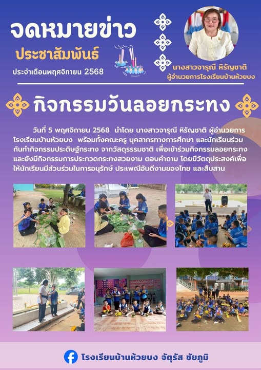 | 1 | เมื่อวันที่ 5 พฤศจิกายน 2568 ที่ผ่านมา ทางโรงเรียนบ้านห้วยบง ได้จัดกิจกรรมวันลอยกระทงขึ้นเพื่อให้นักเรียนได้มีส่วนร่วมในการอนุรักษ์และเรียนรู้ขนบธรรมเนียมประเพณีสืบต่อกันมา ทั้งนี้ยังมีการประกวดกระทง ตอบคำถามเกี่วกับวันลอยกระทง สร้างความสนุกสนานให้กับเด็กๆเป็นอย่างยิ่ง