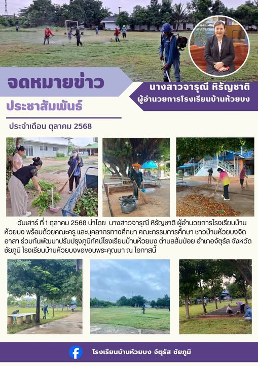 | 2 | เมื่อวันเสาร์ ที่ 1 พฤศจิกายน 2568 ที่ผ่านมา โรงเรียนบ้านห้วยบงนำโดย นางสาวจารุณี หิรัญชาติ พร้อมด้วยผู้นำชุมชน ชาวบ้านห้วยบง ร่วมกันพัฒนาโรงเรียนโดยรอบเพื่อเตรียมความพร้อมการเปิดเรียนในภาคเรียนที่ 2/2568