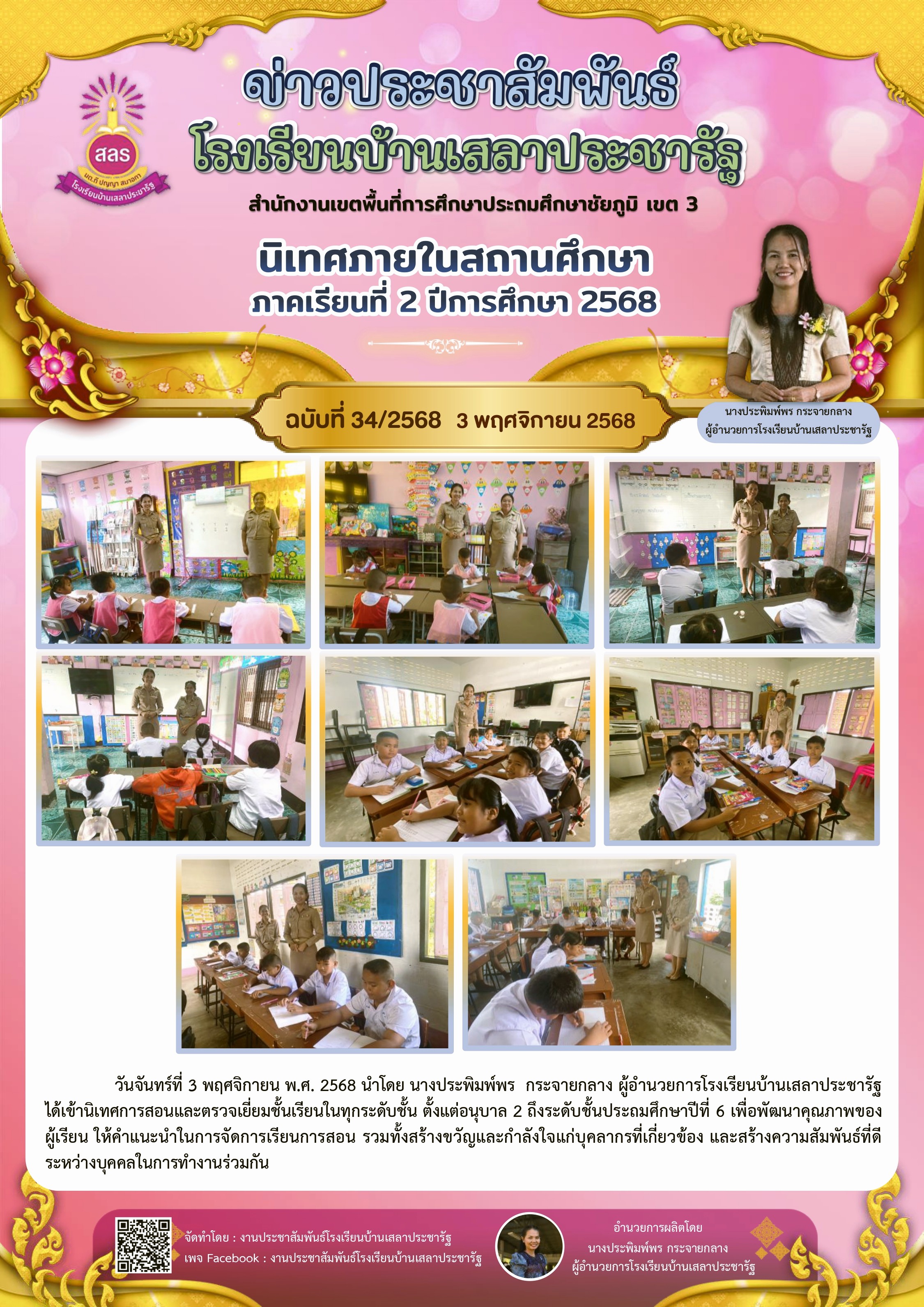 วันจันทร์ที่ 3 พฤศจิกายน พ.ศ. 2568 นำโดย นางประพิมพ์พร กระจายกลาง ผู้อำนวยการโรงเรียนบ้านเสลาประชารัฐ ได้เข้านิเทศการสอนและตรวจเยี่ยมชั้นเรียนในทุกระดับชั้น ตั้งแต่อนุบาล 2 ถึงระดับชั้นประถมศึกษาปีที่ 6 เพื่อพัฒนาคุณภาพของผู้เรียน ให้คำแนะนำในการจัดการเรียนการสอน รวมทั้งสร้างขวัญและกำลังใจแก่บุคลากรที่เกี่ยวข้อง และสร้างความสัมพันธ์ที่ดีระหว่างบุคคลในการทำงานร่วมกัน