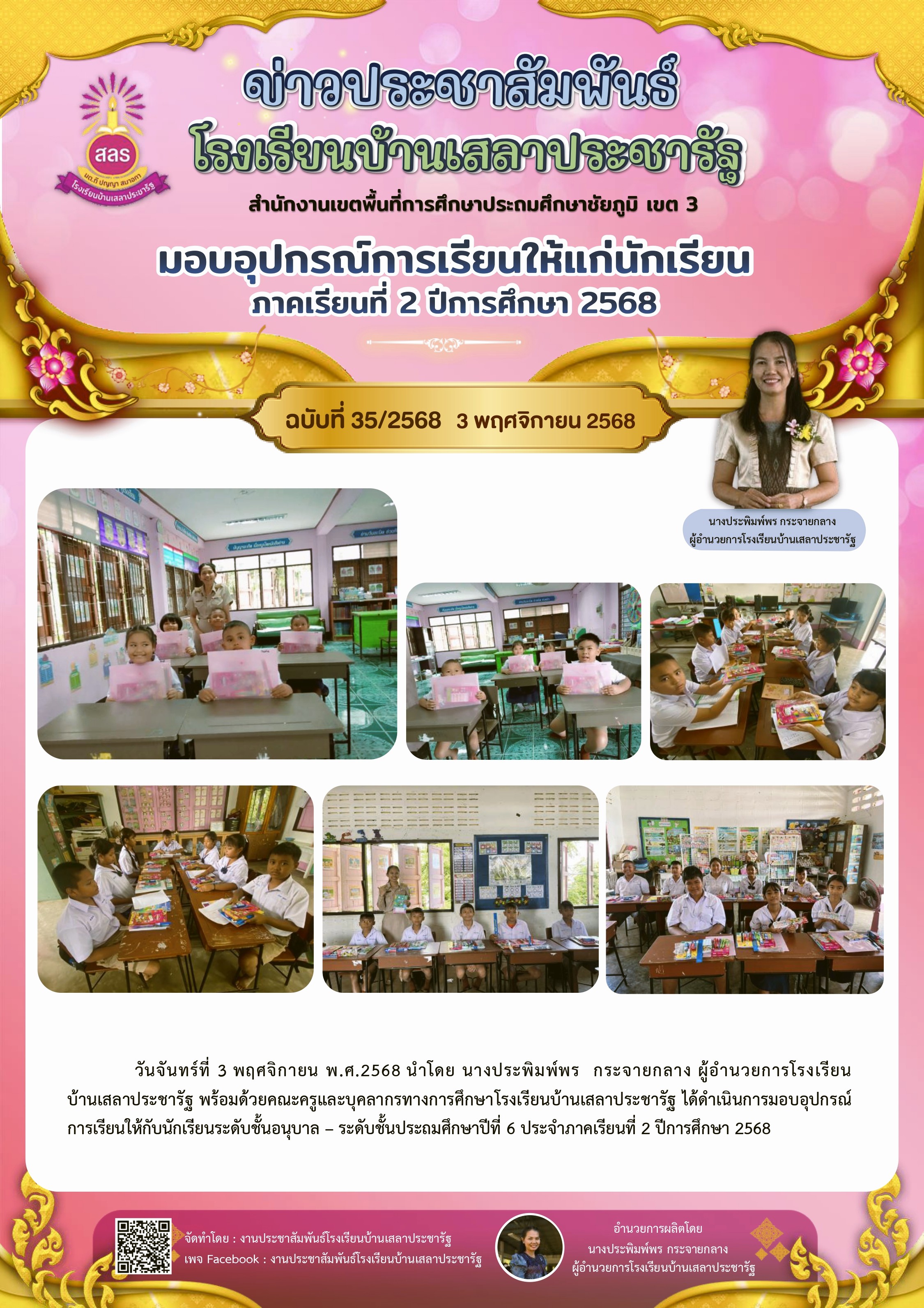 | 2 | วันจันทร์ที่ 3 พฤศจิกายน พ.ศ.2568 นำโดย นางประพิมพ์พร กระจายกลาง ผู้อำนวยการโรงเรียนบ้านเสลาประชารัฐ พร้อมด้วยคณะครูและบุคลากรทางการศึกษาโรงเรียนบ้านเสลาประชารัฐ ได้ดำเนินการมอบอุปกรณ์การเรียนให้กับนักเรียนระดับชั้นอนุบาล – ระดับชั้นประถมศึกษาปีที่ 6 ประจำภาคเรียนที่ 2 ปีการศึกษา 2568 |