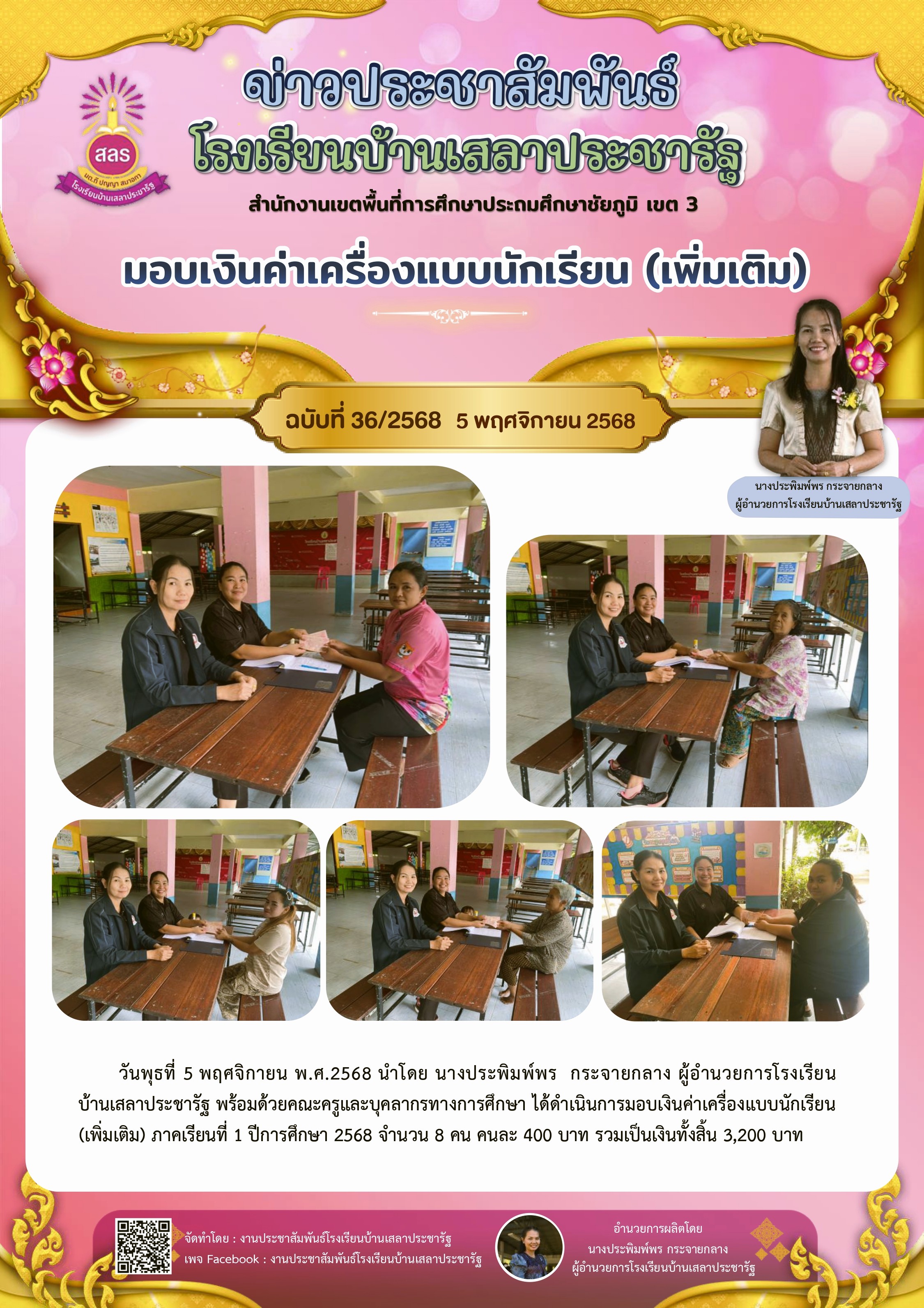 | 3 | วันพุธที่ 5 พฤศจิกายน พ.ศ.2568 นำโดย นางประพิมพ์พร กระจายกลาง ผู้อำนวยการโรงเรียนบ้านเสลาประชารัฐ พร้อมด้วยคณะครูและบุคลากรทางการศึกษา ได้ดำเนินการมอบเงินค่าเครื่องแบบนักเรียน (เพิ่มเติม) ภาคเรียนที่ 1 ปีการศึกษา 2568 จำนวน 8 คน คนละ 400 บาท รวมเป็นเงินทั้งสิ้น 3,200 บาท |
