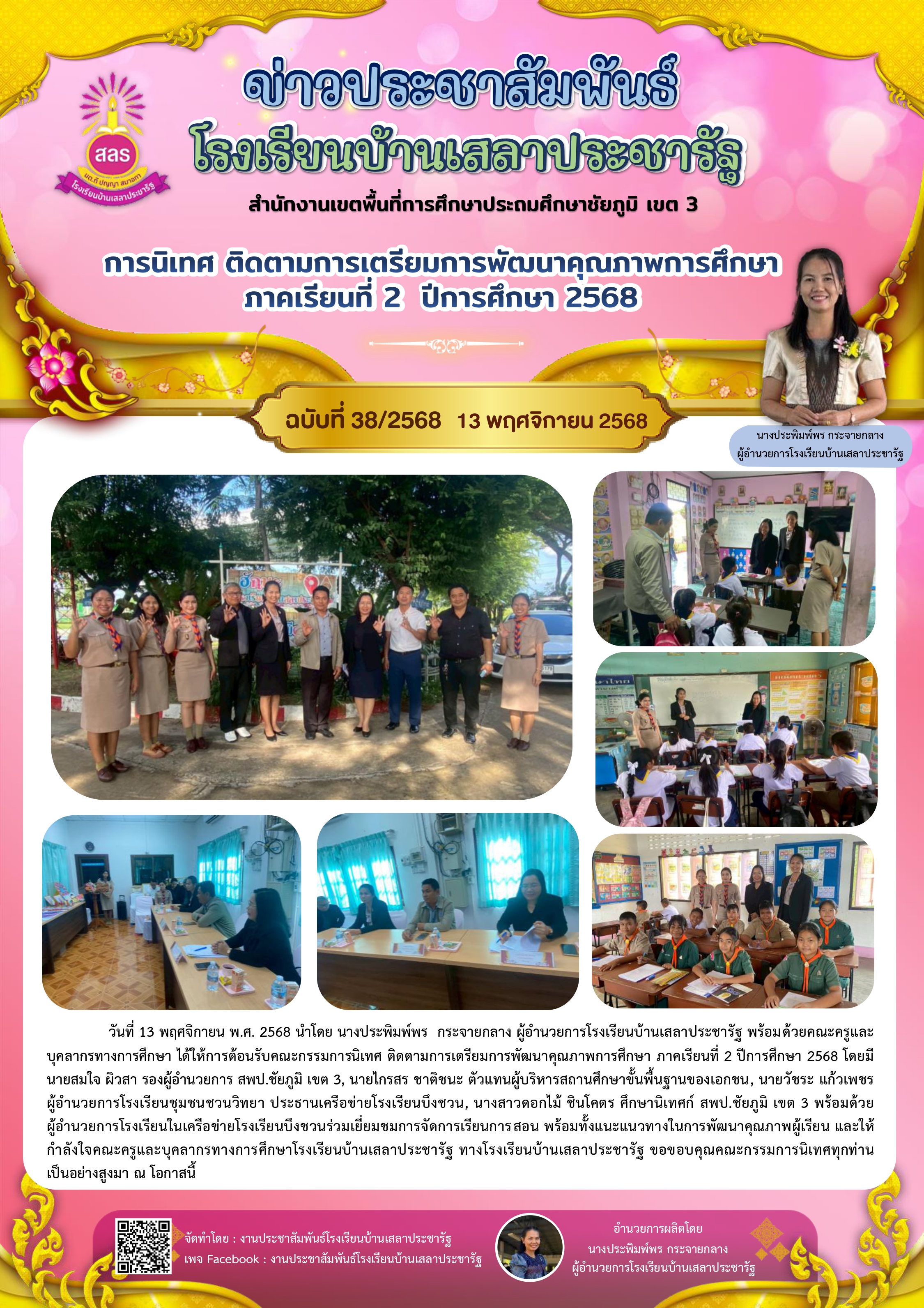 | 1 | วันจันทร์ที่ 3 พฤศจิกายน พ.ศ. 2568 นำโดย นางประพิมพ์พร กระจายกลาง ผู้อำนวยการโรงเรียนบ้านเสลาประชารัฐ ได้เข้านิเทศการสอนและตรวจเยี่ยมชั้นเรียนในทุกระดับชั้น ตั้งแต่อนุบาล 2 ถึงระดับชั้นประถมศึกษาปีที่ 6 เพื่อพัฒนาคุณภาพของผู้เรียน ให้คำแนะนำในการจัดการเรียนการสอน รวมทั้งสร้างขวัญและกำลังใจแก่บุคลากรที่เกี่ยวข้อง และสร้างความสัมพันธ์ที่ดีระหว่างบุคคลในการทำงานร่วมกัน |