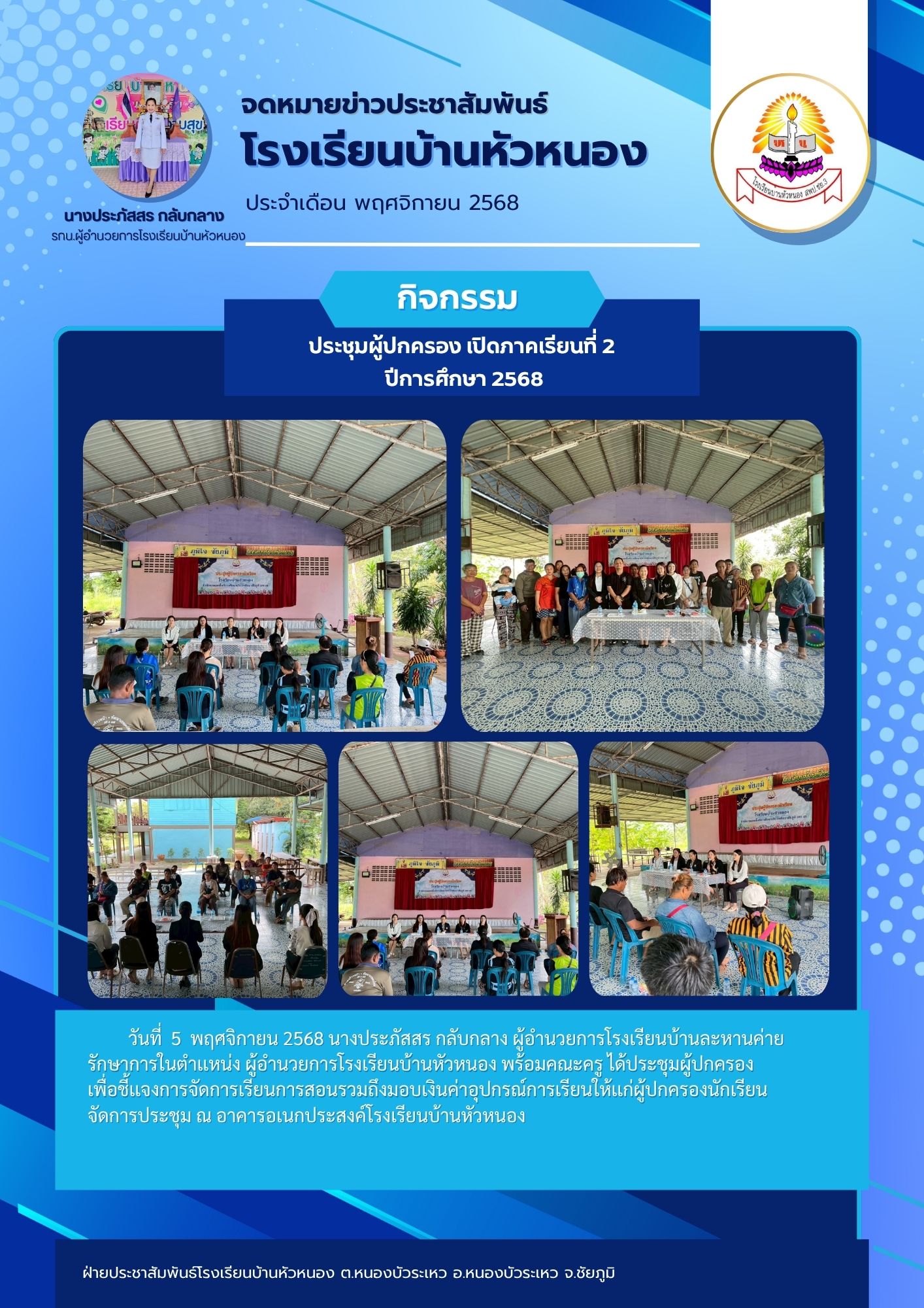 | 1 | วันที่ 5 พฤศจิกายน 2568 นางประภัสสร กลับกลาง ผู้อำนวยการโรงเรียนบ้านละหานค่าย รักษาการในตำเเหน่ง ผู้อำนวยการโรงเรียนบ้านหัวหนอง พร้อมคณะครู ได้ประชุมผู้ปกครองเพื่อชี้เเจงการจัดการเรียนการสอนรวมถึงมอบเงินค่าอุปกรณ์การเรียนให้เเก่ผู้ปกครองนักเรียน จัดการประชุม ณ อาคารอเนกประสงค์โรงเรียนบ้านหัวหนอง |