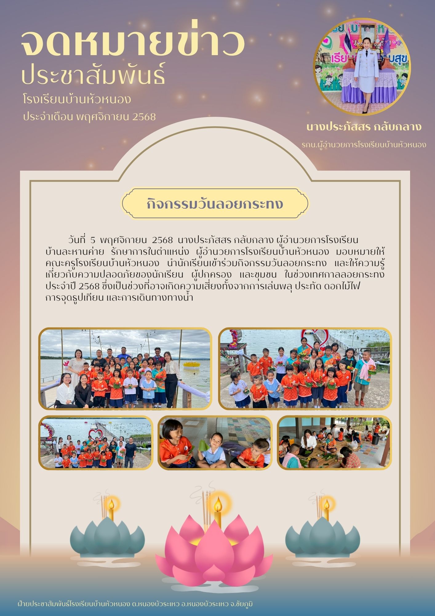 | 2 | วันที่ 5 พฤศจิกายน 2568 นางประภัสสร กลับกลาง ผู้อำนวยการโรงเรียนบ้านละหานค่าย รักษาการในตำเเหน่ง ผู้อำนวยการโรงเรียนบ้านหัวหนอง มอบหมายให้คณะครูโรงเรียนบ้านหัวหนอง นำนักเรียนเข้าร่วมกิจกรรมวันลอยกระทง เเละให้ความรู้เกี่ยวกับความปลอดภัยของนักเรียน ผู้ปกครอง และชุมชน ในช่วงเทศกาลลอยกระทง ประจำปี 2568 ซึ่งเป็นช่วงที่อาจเกิดความเสี่ยงทั้งจากการเล่นพลุ ประทัด ดอกไม้ไฟ การจุดธูปเทียน และการเดินทางทางน้ำ