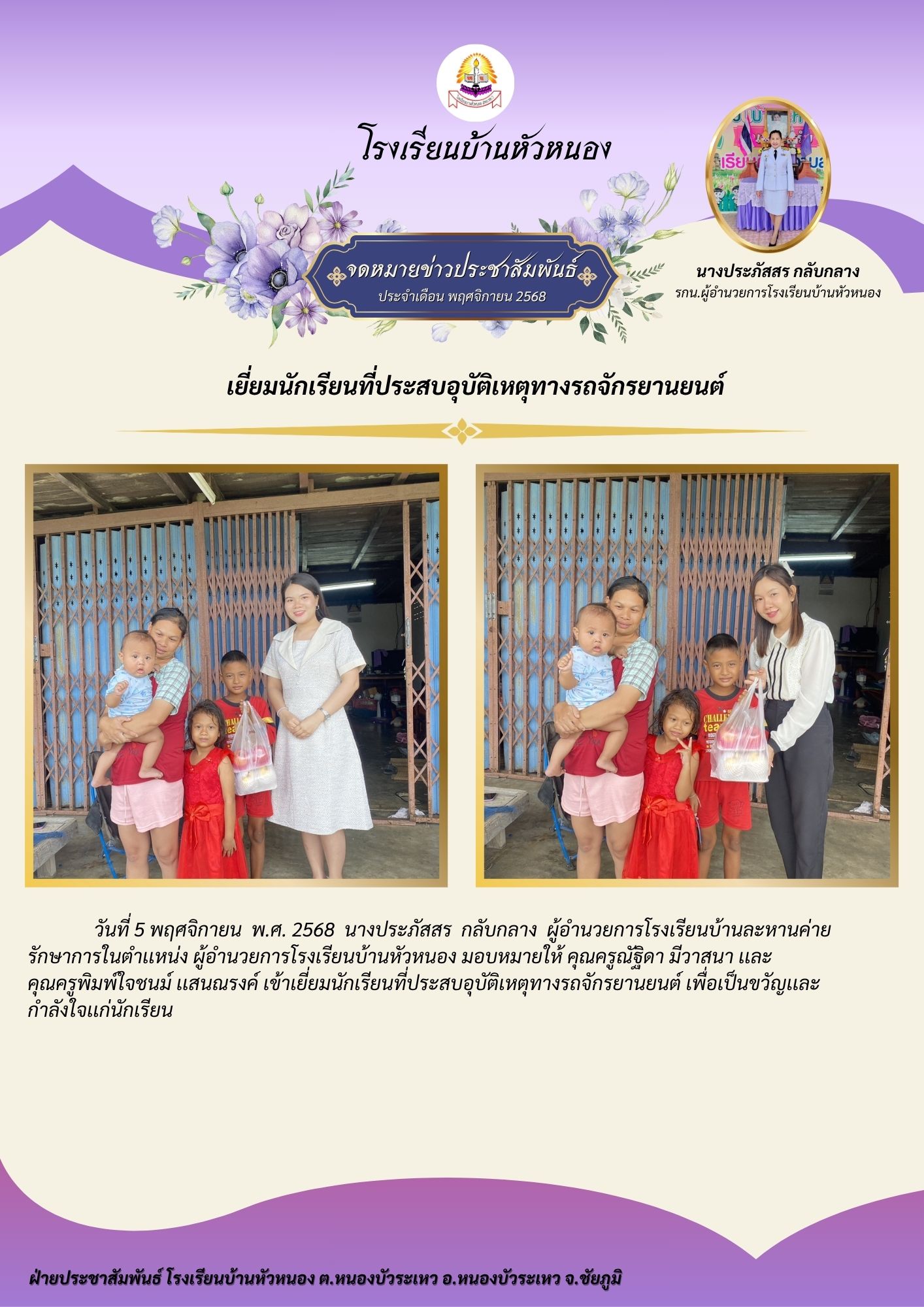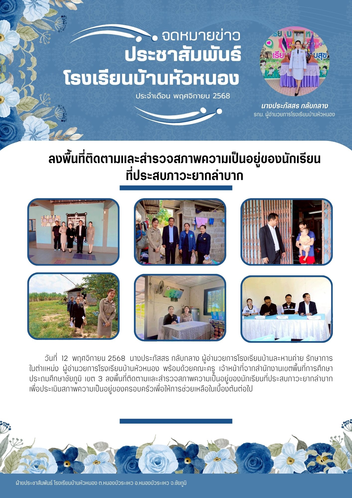 | 8 | วันที่ 12 พฤศจิกายน 2568 นางประภัสสร กลับกลาง ผู้อำนวยการโรงเรียนบ้านละหานค่าย รักษาการในตำเเหน่ง ผู้อำนวยการโรงเรียนบ้านหัวหนอง พร้อมด้วยคณะครู เจ้าหน้าที่จากสำนักงานเขตพื้นที่การศึกษาประถมศึกษาชัยภูมิ เขต 3 ลงพื้นที่ติดตามเเละสำรวจสภาพความเป็นอยู่ของนักเรียนที่ประสบภาวะยากลำบาก เพื่อประเมินสภาพความเป็นอยู่ของครอบครัวเพื่อให้การช่วยเหลือในเบื้องต้นต่อไป