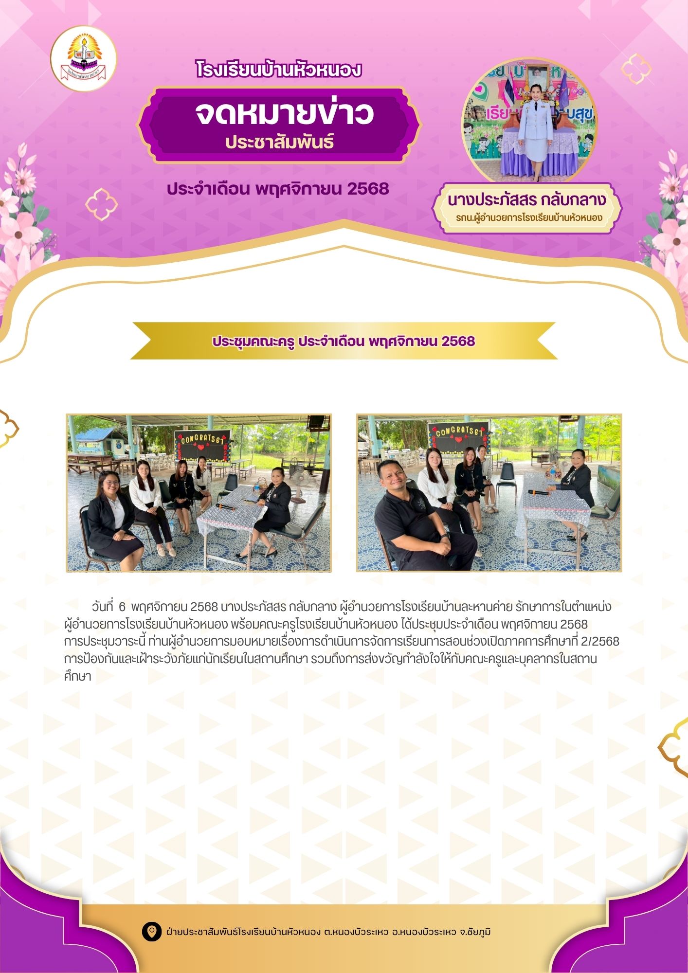 | 4 | วันที่ 6 พฤศจิกายน 2568 นางประภัสสร กลับกลาง ผู้อำนวยการโรงเรียนบ้านละหานค่าย รักษาการในตำเเหน่ง ผู้อำนวยการโรงเรียนบ้านหัวหนอง พร้อมคณะครูโรงเรียนบ้านหัวหนอง ได้ประชุมประจำเดือน พฤศจิกายน 2568 การประชุมวาระนี้ ท่านผู้อำนวยการมอบหมายเรื่องการดำเนินการจัดการเรียนการสอนช่วงเปิดภาคการศึกษาที่ 2/2568 การป้องกันเเละเฝ้าระวังภัยเเก่นักเรียนในสถานศึกษา รวมถึงการส่งขวัญกำลังใจให้กับคณะครูเเละบุคลากรในสถานศึกษา