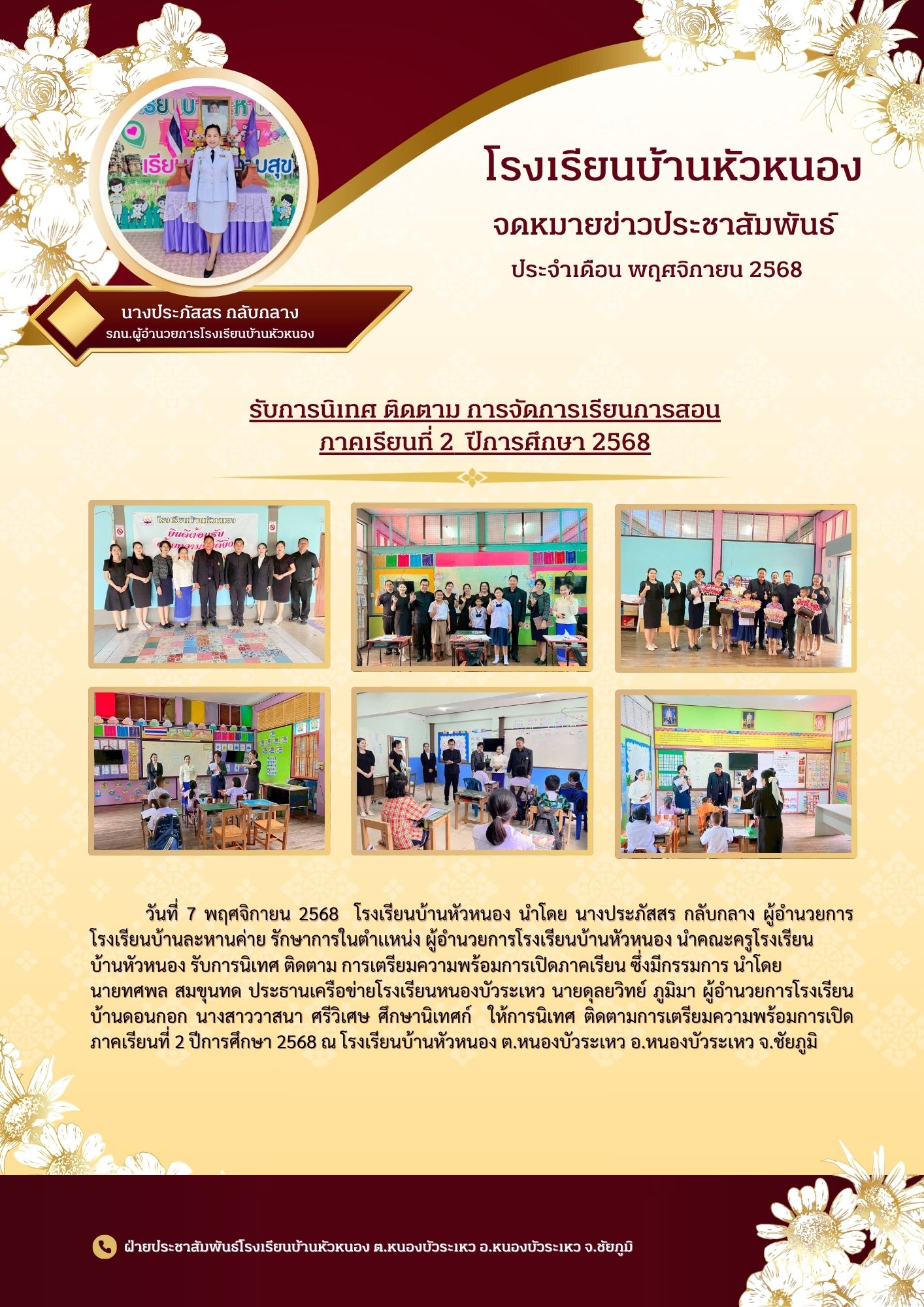 | 5 | วันที่ 7 พฤศจิกายน 2568 โรงเรียนบ้านหัวหนอง นำโดย นางประภัสสร กลับกลาง ผู้อำนวยการโรงเรียนบ้านละหานค่าย รักษาการในตำเเหน่ง ผู้อำนวยการโรงเรียนบ้านหัวหนอง นำคณะครูโรงเรียนบ้านหัวหนอง รับการนิเทศ ติดตาม การเตรียมความพร้อมการเปิดภาคเรียน ซึ่งมีกรรมการ นำโดย นายทศพล สมขุนทด ประธานเครือข่ายโรงเรียนหนองบัวระเหว นายดุลยวิทย์ ภูมิมา ผู้อำนวยการโรงเรียนบ้านดอนกอก นางสาววาสนา ศรีวิเศษ ศึกษานิเทศก์ ให้การนิเทศ ติดตามการเตรียมความพร้อมการเปิดภาคเรียนที่ 2 ปีการศึกษา 2568 ณ โรงเรียนบ้านหัวหนอง ต.หนองบัวระเหว อ.หนองบัวระเหว จ.ชัยภูมิ