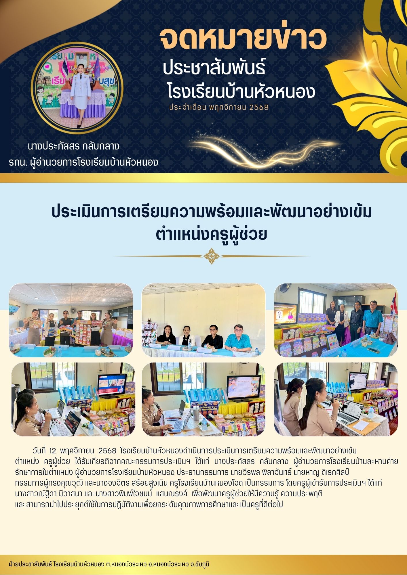 | 6 | วันที่ 12 พฤศจิกายน 2568 โรงเรียนบ้านหัวหนองดำเนินการประเมินการเตรียมความพร้อมเเละพัฒนาอย่างเข้ม ตำเเหน่ง ครูผู้ช่วย ได้รับเกียรติจากคณะกรรมการประเมินฯ ได้เเก่ นางประภัสสร กลับกลาง ผู้อำนวยการโรงเรียนบ้านละหานค่าย รักษาการในตำเเหน่ง ผู้อำนวยการโรงเรียนบ้านหัวหนอง ประธานกรรมการ นายวีรพล พิลาจันทร์ นายหาญ ดิเรกศิลป์ กรรมการผู้ทรงคุณวุฒิ เเละนางจงจิตร สร้อยสูงเนิน ครูโรงเรียนบ้านหนองโจด เป็นกรรมการ โดยครูผู้เข้ารับการประเมินฯ ได้เเก่ นางสาวณัฐิดา มีวาสนา เเละนางสาวพิมพ์ใจชนม์ เเสนณรงค์ เพื่อพัฒนาครูผู้ช่วยให้มีความรู้ ความประพฤติ เเละสามารถนำไปประยุกต์ใช้ในการปฏิบัติงานเพื่อยกระดับคุณภาพการศึกษาเเละเป็นครูที่ดีต่อไป