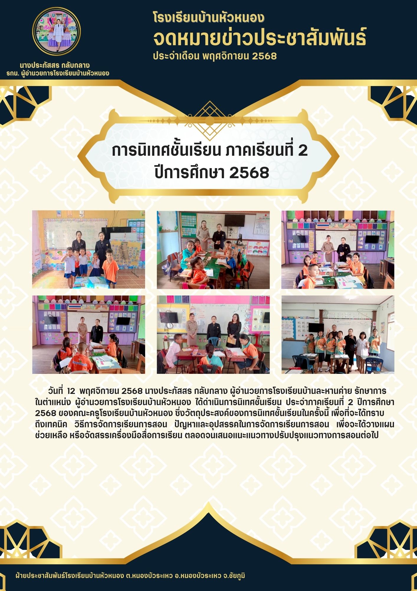 | 7 | วันที่ 12 พฤศจิกายน 2568 นางประภัสสร กลับกลาง ผู้อำนวยการโรงเรียนบ้านละหานค่าย รักษาการในตำเเหน่ง ผู้อำนวยการโรงเรียนบ้านหัวหนอง ได้ดำเนินการนิเทศชั้นเรียน ประจำภาคเรียนที่ 2 ปีการศึกษา 2568 ของคณะครูโรงเรียนบ้านหัวหนอง ซึ่งวัตถุประสงค์ของการนิเทศชั้นเรียนในครั้งนี้ เพื่อที่จะได้ทราบถึงเทคนิค วิธีการจัดการเรียนการสอน ปัญหาเเละอุปสรรคในการจัดการเรียนการสอน เพื่อจะได้วางเเผนช่วยเหลือ หรือจัดสรรเครื่องมือสื่อการเรียน ตลอดจนเสนอเเนะเเนวทางปรับปรุงเเนวทางการสอนต่อไป