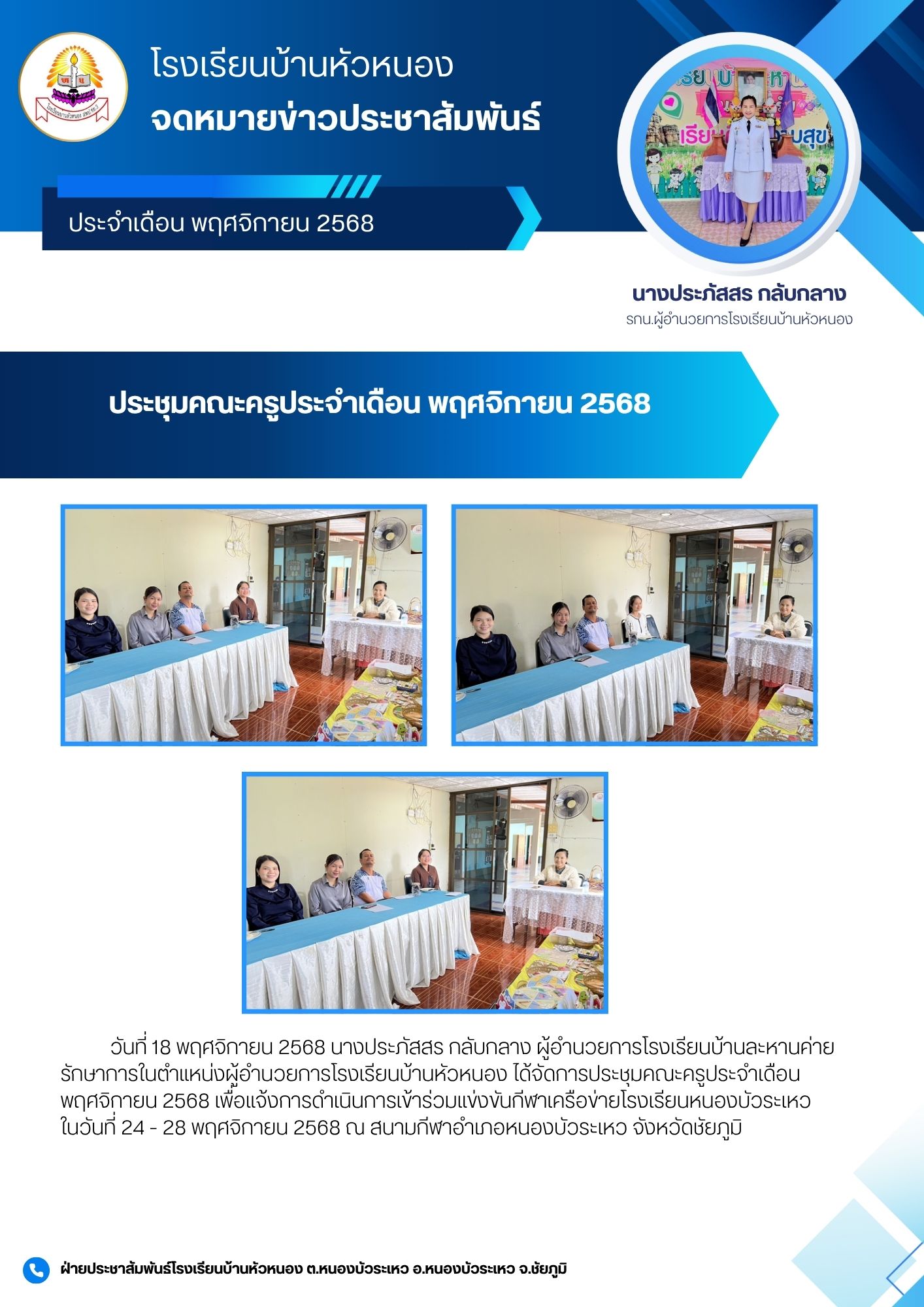 | 9 | วันที่ 18 พฤศจิกายน 2568 นางประภัสสร กลับกลาง ผู้อำนวยการโรงเรียนบ้านละหานค่าย รักษาการในตำแหน่งผู้อำนวยการโรงเรียนบ้านหัวหนอง ได้จัดการประชุมคณะครูประจำเดือน