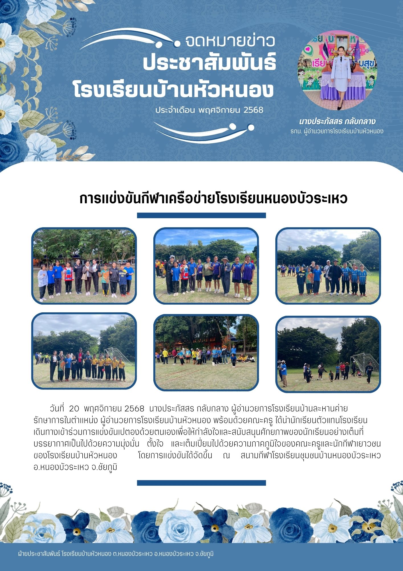 | 10 | วันที่ 20 พฤศจิกายน 2568 นางประภัสสร กลับกลาง ผู้อำนวยการโรงเรียนบ้านละหานค่าย รักษาการในตำเเหน่ง ผู้อำนวยการโรงเรียนบ้านหัวหนอง พร้อมด้วยคณะครู ได้นำนักเรียนตัวแทนโรงเรียนเดินทางเข้าร่วมการแข่งขันเปตองด้วยตนเองเพื่อให้กำลังใจและสนับสนุนศักยภาพของนักเรียนอย่างเต็มที่ บรรยากาศเป็นไปด้วยความมุ่งมั่น ตั้งใจ และเต็มเปี่ยมไปด้วยความภาคภูมิใจของคณะครูและนักกีฬาเยาวชนของโรงเรียนบ้านหัวหนอง โดยการเเข่งขันได้จัดขึ้น ณ สนามกีฬาโรงเรียนชุมชนบ้านหนองบัวระเหว อ.หนองบัวระเหว จ.ชัยภูมิ