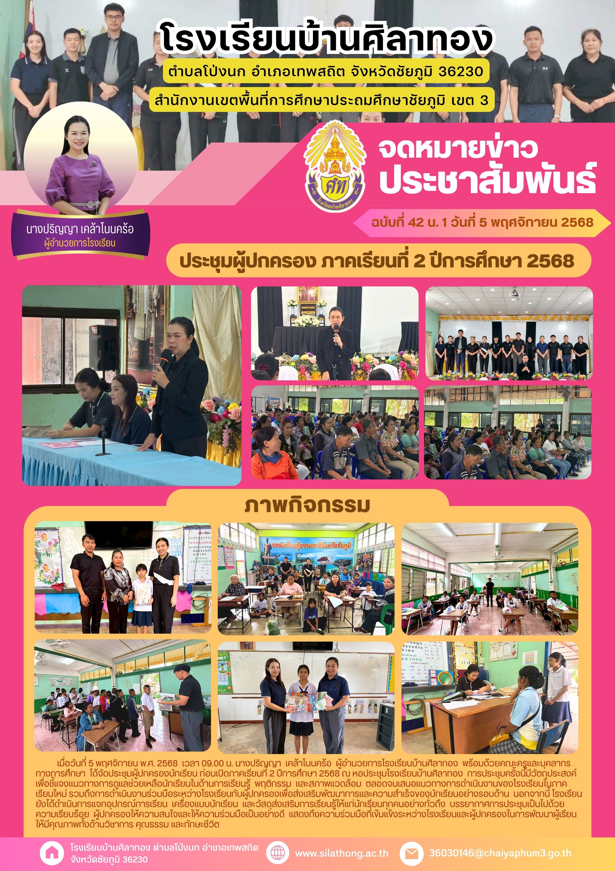 | 1 | เมื่อวันที่ 5 พฤศจิกายน พ.ศ. 2568 เวลา 09.00 น. นางปริญญา เคล้าโนนคร้อ ผู้อำนวยการโรงเรียนบ้านศิลาทอง พร้อมด้วยคณะครูและบุคลากรทางการศึกษา ได้จัดประชุมผู้ปกครองนักเรียน ก่อนเปิดภาคเรียนที่ 2 ปีการศึกษา 2568 ณ หอประชุมโรงเรียนบ้านศิลาทอง การประชุมครั้งนี้มีวัตถุประสงค์เพื่อชี้แจงแนวทางการดูแลช่วยเหลือนักเรียนในด้านการเรียนรู้ พฤติกรรม และสภาพแวดล้อม ตลอดจนเสนอแนวทางการดำเนินงานของโรงเรียนในภาคเรียนใหม่ รวมถึงการดำเนินงานร่วมมือระหว่างโรงเรียนกับผู้ปกครองเพื่อส่งเสริมพัฒนาการและความสำเร็จของนักเรียนอย่างรอบด้าน นอกจากนี้ โรงเรียนยังได้ดำเนินการแจกอุปกรณ์การเรียน เครื่องแบบนักเรียน และวัสดุส่งเสริมการเรียนรู้ให้แก่นักเรียนทุกคนอย่างทั่วถึง บรรยากาศการประชุมเป็นไปด้วยความเรียบร้อย ผู้ปกครองให้ความสนใจและให้ความร่วมมือเป็นอย่างดี แสดงถึงความร่วมมือที่เข้มแข็งระหว่างโรงเรียนและผู้ปกครองในการพัฒนาผู้เรียนให้มีคุณภาพทั้งด้านวิชาการ คุณธรรม และทักษะชีวิต