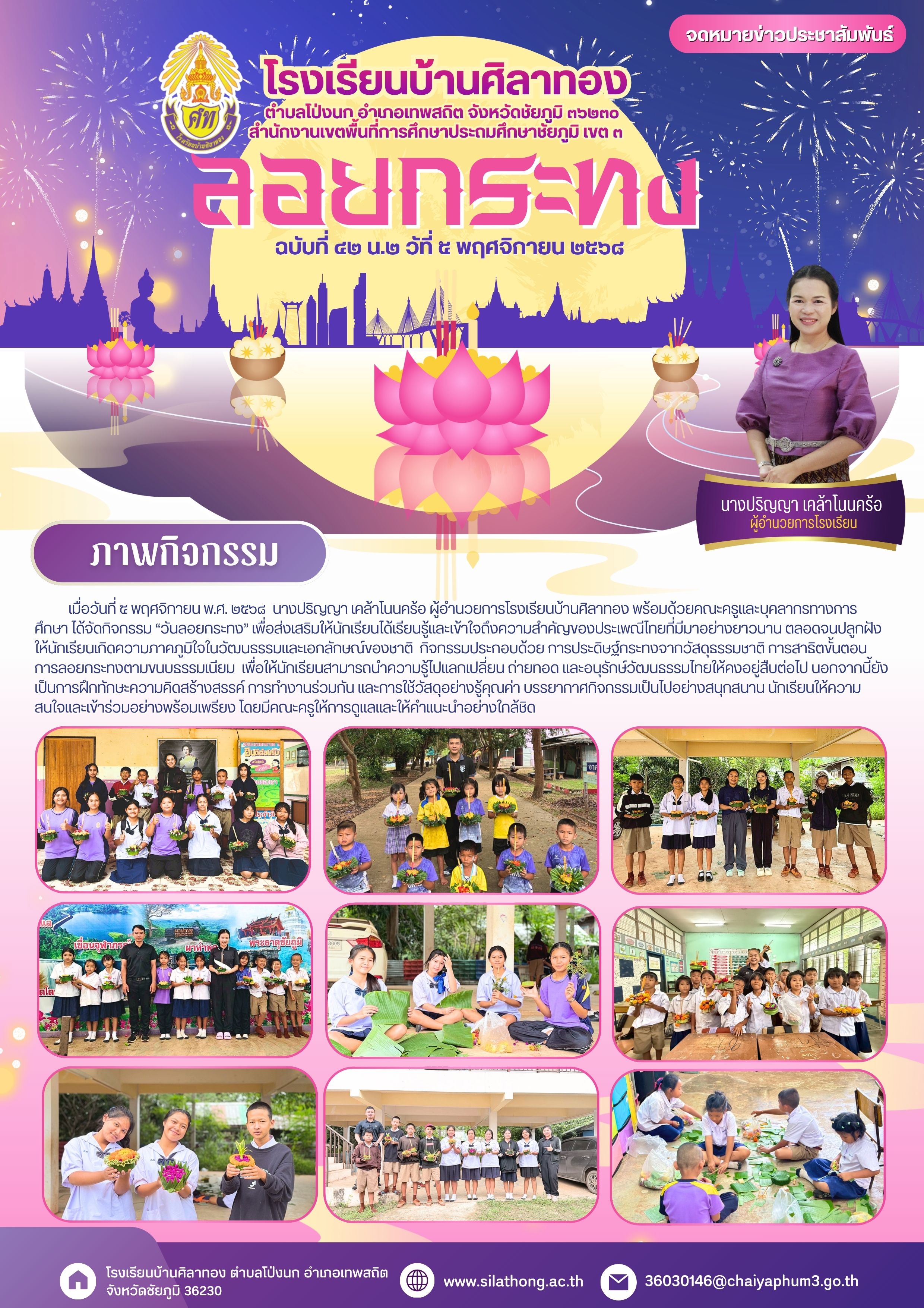 | 2 | เมื่อวันที่ ๕ พฤศจิกายน พ.ศ. ๒๕๖๘ นางปริญญา เคล้าโนนคร้อ ผู้อำนวยการโรงเรียนบ้านศิลาทอง พร้อมด้วยคณะครูและบุคลากรทางการศึกษา ได้จัดกิจกรรม “วันลอยกระทง” เพื่อส่งเสริมให้นักเรียนได้เรียนรู้และเข้าใจถึงความสำคัญของประเพณีไทยที่มีมาอย่างยาวนาน ตลอดจนปลูกฝังให้นักเรียนเกิดความภาคภูมิใจในวัฒนธรรมและเอกลักษณ์ของชาติ กิจกรรมประกอบด้วย การประดิษฐ์กระทงจากวัสดุธรรมชาติ การสาธิตขั้นตอนการลอยกระทงตามขนบธรรมเนียม เพื่อให้นักเรียนสามารถนำความรู้ไปแลกเปลี่ยน ถ่ายทอด และอนุรักษ์วัฒนธรรมไทยให้คงอยู่สืบต่อไป นอกจากนี้ยังเป็นการฝึกทักษะความคิดสร้างสรรค์ การทำงานร่วมกัน และการใช้วัสดุอย่างรู้คุณค่า บรรยากาศกิจกรรมเป็นไปอย่างสนุกสนาน นักเรียนให้ความสนใจและเข้าร่วมอย่างพร้อมเพรียง โดยมีคณะครูให้การดูแลและให้คำแนะนำอย่างใกล้ชิด