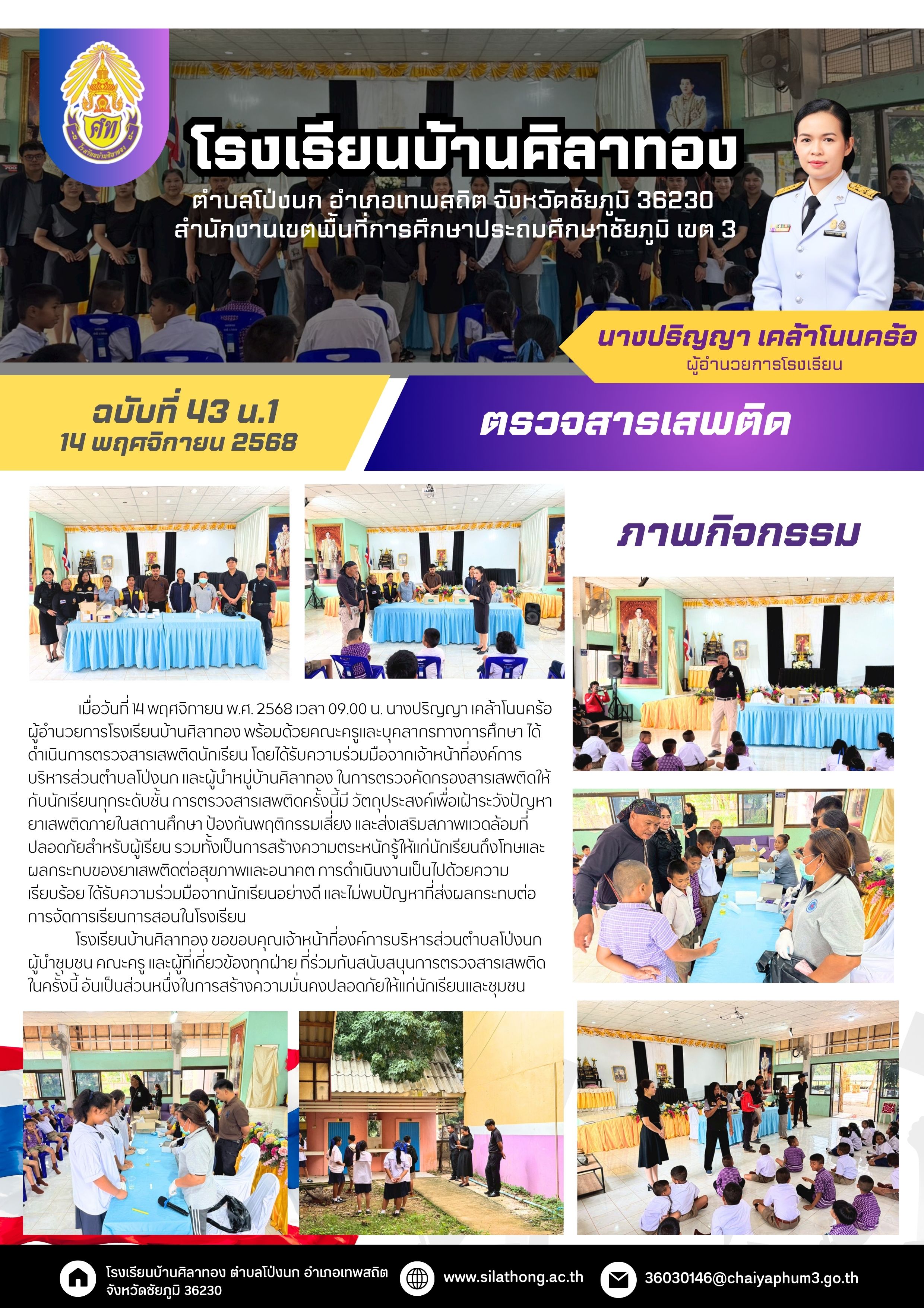| 3 | เมื่อวันที่ 14 พฤศจิกายน พ.ศ. 2568 เวลา 09.00 น. นางปริญญา เคล้าโนนคร้อ ผู้อำนวยการโรงเรียนบ้านศิลาทอง พร้อมด้วยคณะครูและบุคลากรทางการศึกษา ได้ดำเนินการตรวจสารเสพติดนักเรียน โดยได้รับความร่วมมือจากเจ้าหน้าที่องค์การบริหารส่วนตำบลโป่งนก และผู้นำหมู่บ้านศิลาทอง ในการตรวจคัดกรองสารเสพติดให้กับนักเรียนทุกระดับชั้น การตรวจสารเสพติดครั้งนี้มี วัตถุประสงค์เพื่อเฝ้าระวังปัญหายาเสพติดภายในสถานศึกษา ป้องกันพฤติกรรมเสี่ยง และส่งเสริมสภาพแวดล้อมที่ปลอดภัยสำหรับผู้เรียน รวมทั้งเป็นการสร้างความตระหนักรู้ให้แก่นักเรียนถึงโทษและผลกระทบของยาเสพติดต่อสุขภาพและอนาคต การดำเนินงานเป็นไปด้วยความเรียบร้อย ได้รับความร่วมมือจากนักเรียนอย่างดี และไม่พบปัญหาที่ส่งผลกระทบต่อการจัดการเรียนการสอนในโรงเรียน โรงเรียนบ้านศิลาทอง ขอขอบคุณเจ้าหน้าที่องค์การบริหารส่วนตำบลโป่งนก ผู้นำชุมชน คณะครู และผู้ที่เกี่ยวข้องทุกฝ่าย ที่ร่วมกันสนับสนุนการตรวจสารเสพติดในครั้งนี้ อันเป็นส่วนหนึ่งในการสร้างความมั่นคงปลอดภัยให้แก่นักเรียนและชุมชน |