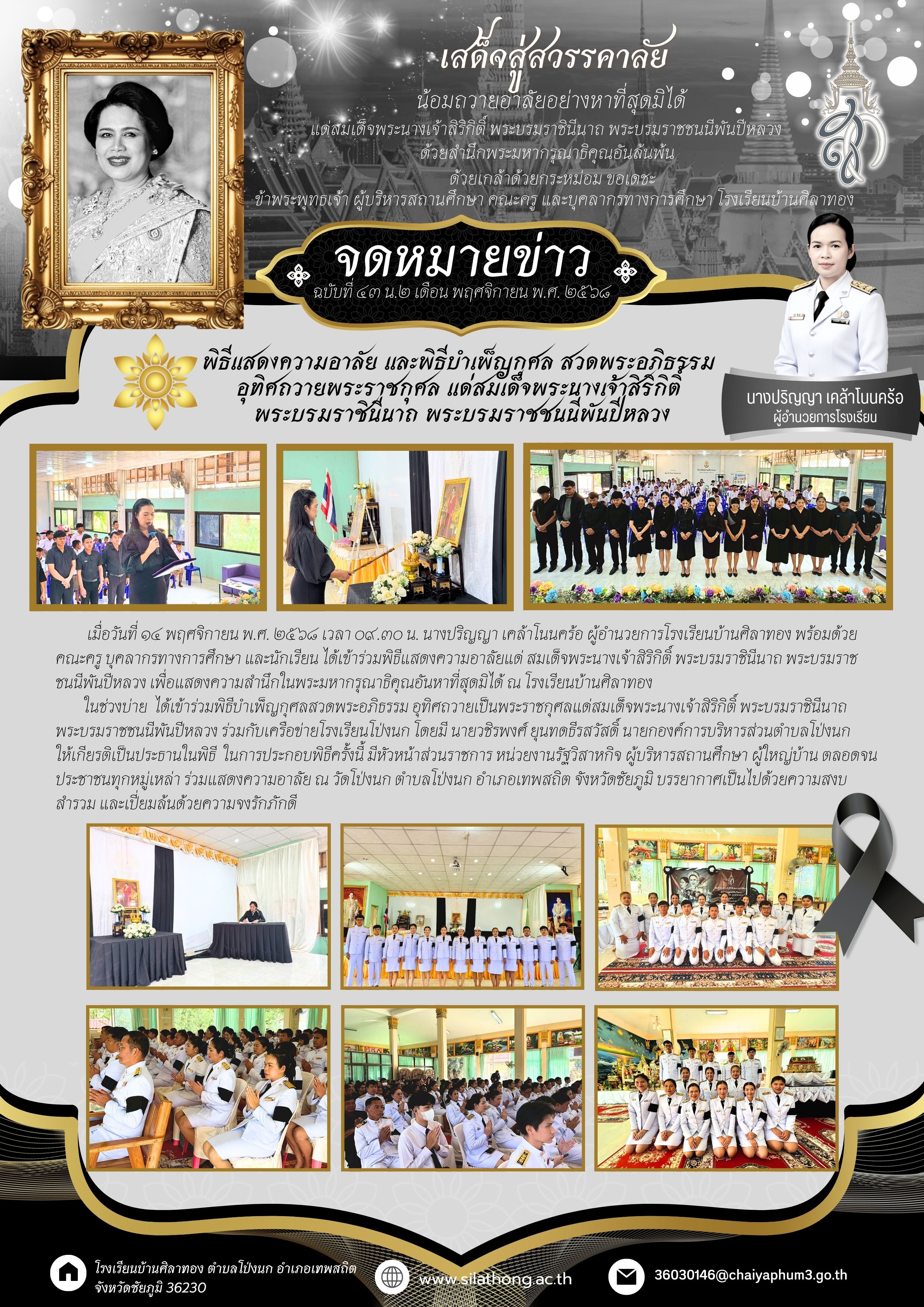 | 4 | เมื่อวันที่ ๑๔ พฤศจิกายน พ.ศ. ๒๕๖๘ เวลา ๐๙.๓๐ น. นางปริญญา เคล้าโนนคร้อ ผู้อำนวยการโรงเรียนบ้านศิลาทอง พร้อมด้วยคณะครู บุคลากรทางการศึกษา และนักเรียน ได้เข้าร่วมพิธีแสดงความอาลัยแด่ สมเด็จพระนางเจ้าสิริกิติ์ พระบรมราชินีนาถ พระบรมราชชนนีพันปีหลวง เพื่อแสดงความสำนึกในพระมหากรุณาธิคุณอันหาที่สุดมิได้ ณ โรงเรียนบ้านศิลาทอง ในช่วงบ่าย ได้เข้าร่วมพิธีบำเพ็ญกุศลสวดพระอภิธรรม อุทิศถวายเป็นพระราชกุศลแด่สมเด็จพระนางเจ้าสิริกิติ์ พระบรมราชินีนาถ พระบรมราชชนนีพันปีหลวง ร่วมกับเครือข่ายโรงเรียนโป่งนก โดยมี นายวชิรพงศ์ ยุนทดธีรสวัสดิ์ นายกองค์การบริหารส่วนตำบลโป่งนก ให้เกียรติเป็นประธานในพิธี ในการประกอบพิธีครั้งนี้ มีหัวหน้าส่วนราชการ หน่วยงานรัฐวิสาหกิจ ผู้บริหารสถานศึกษา ผู้ใหญ่บ้าน ตลอดจนประชาชนทุกหมู่เหล่า ร่วมแสดงความอาลัย ณ วัดโป่งนก ตำบลโป่งนก อำเภอเทพสถิต จังหวัดชัยภูมิ บรรยากาศเป็นไปด้วยความสงบ สำรวม และเปี่ยมล้นด้วยความจงรักภักดี |