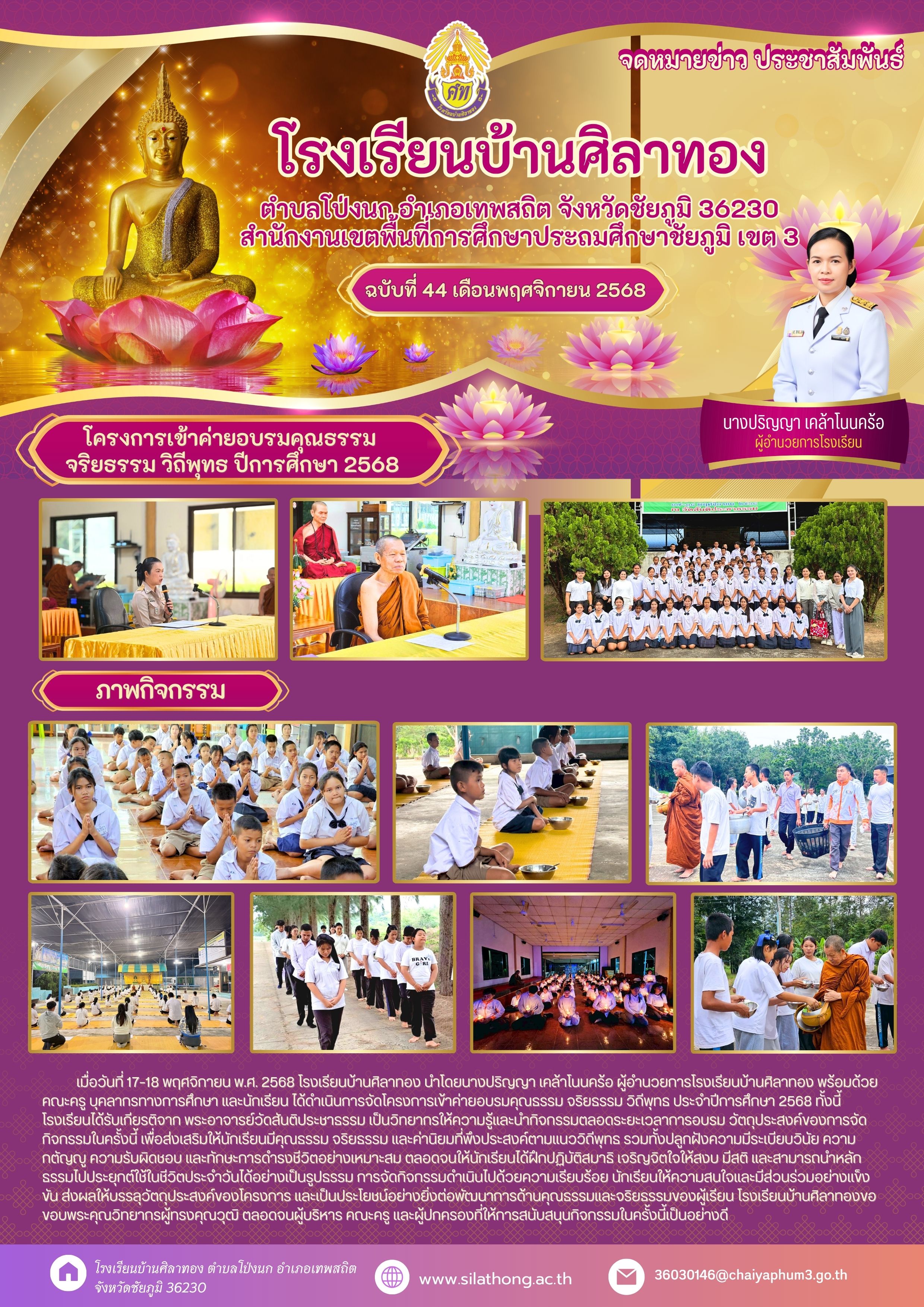 | 5 | เมื่อวันที่ 17–18 พฤศจิกายน พ.ศ. 2568 โรงเรียนบ้านศิลาทอง นำโดยนางปริญญา เคล้าโนนคร้อ ผู้อำนวยการโรงเรียนบ้านศิลาทอง พร้อมด้วย คณะครู บุคลากรทางการศึกษา และนักเรียน ได้ดำเนินการจัดโครงการเข้าค่ายอบรมคุณธรรม จริยธรรม วิถีพุทธ ประจำปีการศึกษา 2568 ทั้งนี้ โรงเรียนได้รับเกียรติจาก พระอาจารย์วัดสันติประชาธรรม เป็นวิทยากรให้ความรู้และนำกิจกรรมตลอดระยะเวลาการอบรม วัตถุประสงค์ของการจัดกิจกรรมในครั้งนี้ เพื่อส่งเสริมให้นักเรียนมีคุณธรรม จริยธรรม และค่านิยมที่พึงประสงค์ตามแนววิถีพุทธ รวมทั้งปลูกฝังความมีระเบียบวินัย ความกตัญญู ความรับผิดชอบ และทักษะการดำรงชีวิตอย่างเหมาะสม ตลอดจนให้นักเรียนได้ฝึกปฏิบัติสมาธิ เจริญจิตใจให้สงบ มีสติ และสามารถนำหลักธรรมไปประยุกต์ใช้ในชีวิตประจำวันได้อย่างเป็นรูปธรรม การจัดกิจกรรมดำเนินไปด้วยความเรียบร้อย นักเรียนให้ความสนใจและมีส่วนร่วมอย่างแข็งขัน ส่งผลให้บรรลุวัตถุประสงค์ของโครงการ และเป็นประโยชน์อย่างยิ่งต่อพัฒนาการด้านคุณธรรมและจริยธรรมของผู้เรียน โรงเรียนบ้านศิลาทองขอขอบพระคุณวิทยากรผู้ทรงคุณวุฒิ ตลอดจนผู้บริหาร คณะครู และผู้ปกครองที่ให้การสนับสนุนกิจกรรมในครั้งนี้เป็นอย่างดี