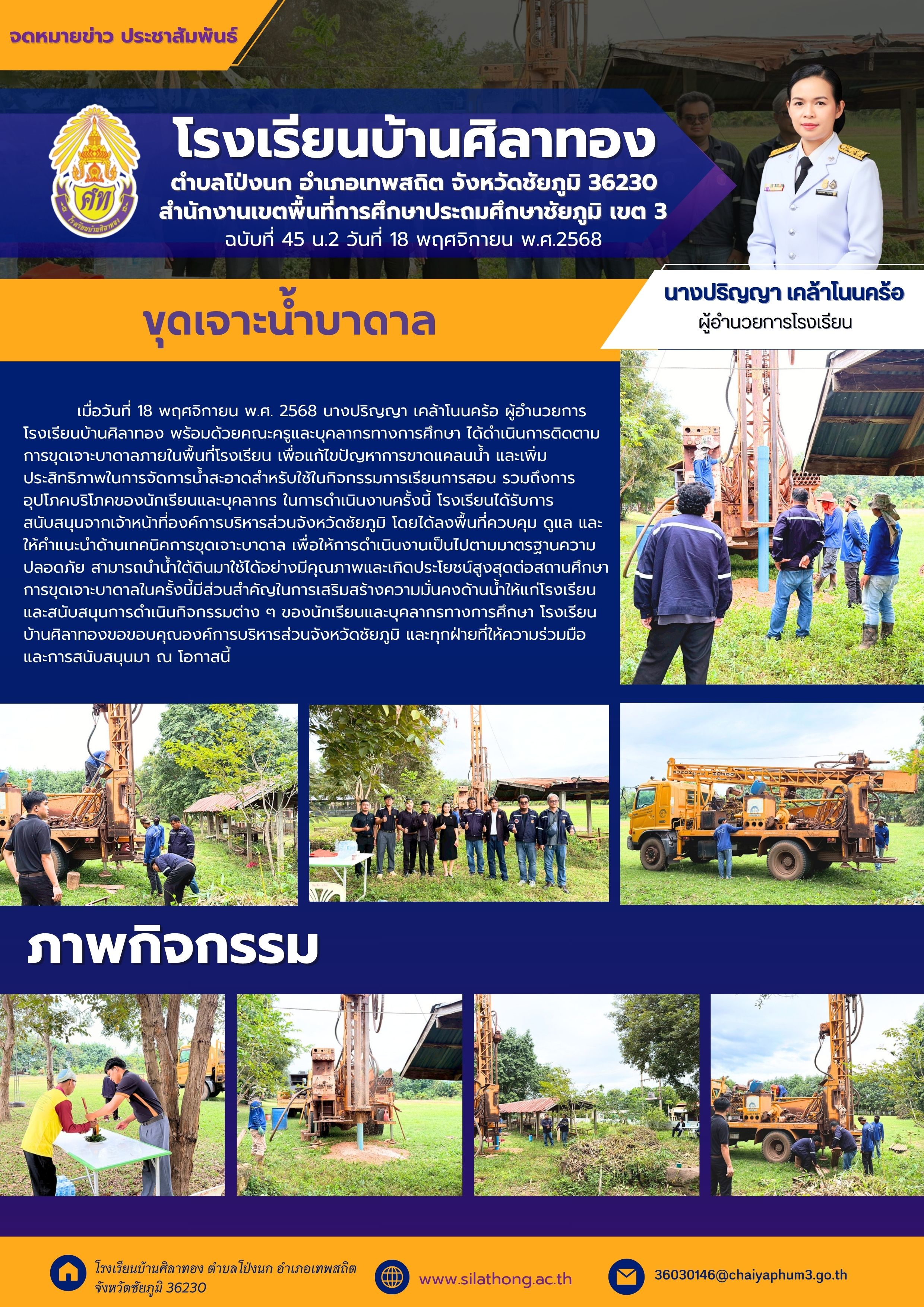 | 7 | เมื่อวันที่ 18 พฤศจิกายน พ.ศ. 2568 นางปริญญา เคล้าโนนคร้อ ผู้อำนวยการโรงเรียนบ้านศิลาทอง พร้อมด้วยคณะครูและบุคลากรทางการศึกษา ได้ดำเนินการติดตามการขุดเจาะบาดาลภายในพื้นที่โรงเรียน เพื่อแก้ไขปัญหาการขาดแคลนน้ำ และเพิ่มประสิทธิภาพในการจัดการน้ำสะอาดสำหรับใช้ในกิจกรรมการเรียนการสอน รวมถึงการอุปโภคบริโภคของนักเรียนและบุคลากร ในการดำเนินงานครั้งนี้ โรงเรียนได้รับการสนับสนุนจากเจ้าหน้าที่องค์การบริหารส่วนจังหวัดชัยภูมิ โดยได้ลงพื้นที่ควบคุม ดูแล และให้คำแนะนำด้านเทคนิคการขุดเจาะบาดาล เพื่อให้การดำเนินงานเป็นไปตามมาตรฐานความปลอดภัย สามารถนำน้ำใต้ดินมาใช้ได้อย่างมีคุณภาพและเกิดประโยชน์สูงสุดต่อสถานศึกษา การขุดเจาะบาดาลในครั้งนี้มีส่วนสำคัญในการเสริมสร้างความมั่นคงด้านน้ำให้แก่โรงเรียน และสนับสนุนการดำเนินกิจกรรมต่าง ๆ ของนักเรียนและบุคลากรทางการศึกษา โรงเรียนบ้านศิลาทองขอขอบคุณองค์การบริหารส่วนจังหวัดชัยภูมิ และทุกฝ่ายที่ให้ความร่วมมือและการสนับสนุนมา ณ โอกาสนี้