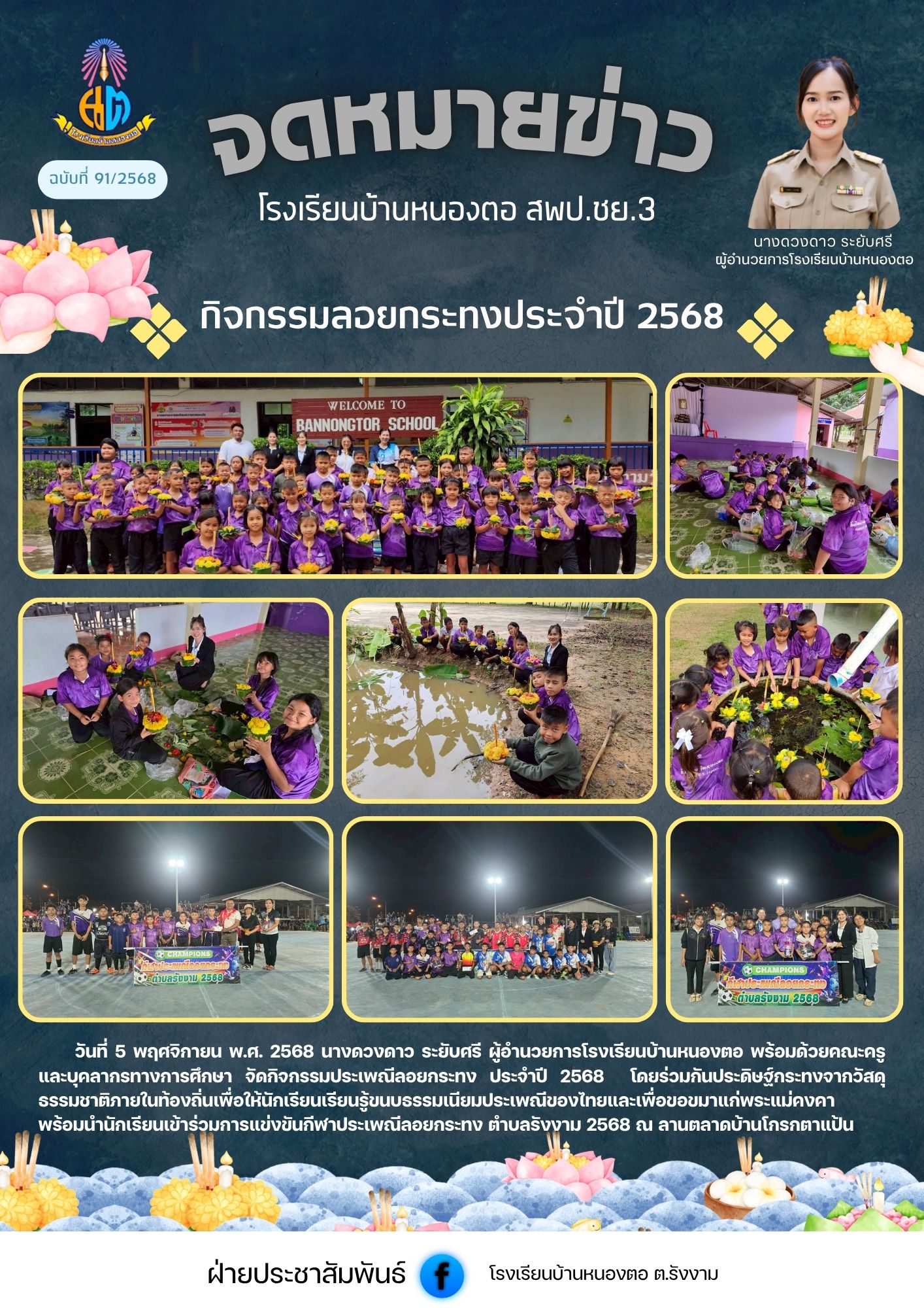 | 1 | วันที่ 5 พฤศจิกายน พ.ศ. 2568 นางดวงดาว ระยับศรี ผู้อำนวยการโรงเรียนบ้านหนองตอ พร้อมด้วยคณะครู และบุคลากรทางการศึกษา จัดกิจกรรมประเพณีลอยกระทง ประจำปี 2568 โดยร่วมกันประดิษฐ์กระทงจากวัสดุธรรมชาติภายในท้องถิ่นเพื่อให้นักเรียนเรียนรู้ขนบธรรมเนียมประเพณีของไทยและเพื่อขอขมาแก่พระแม่คงคา พร้อมนำนักเรียนเข้าร่วมการแข่งขันกีฬาประเพณีลอยกระทง ตำบลรังงาม 2568 ณ ลานตลาดบ้านโกรกตาแป้น |
