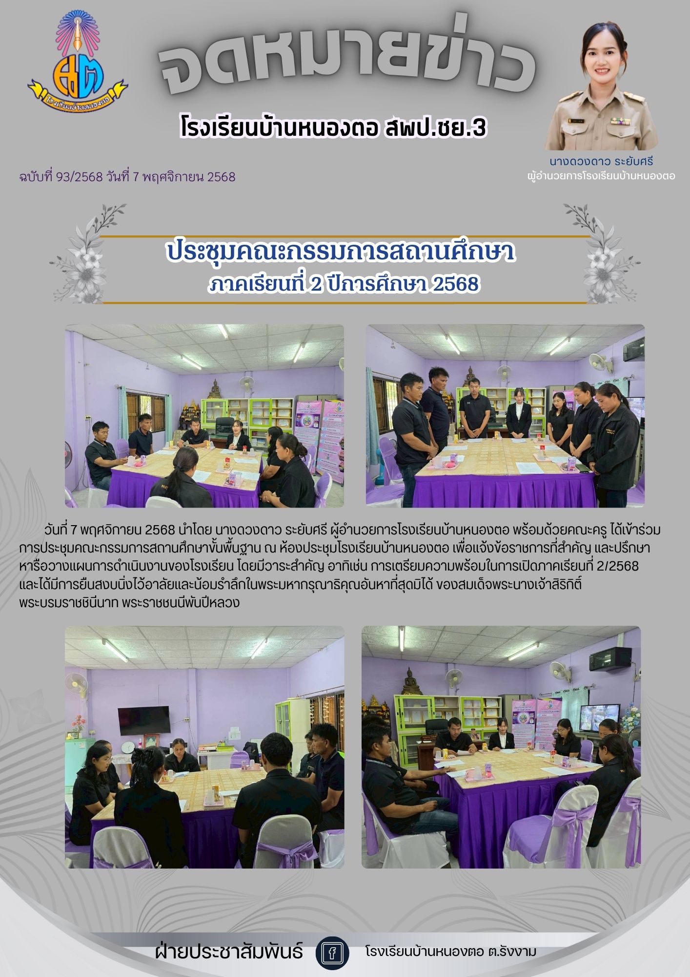 | 2 | วันที่ 7 พฤศจิกายน 2568 นำโดย นางดวงดาว ระยับศรี ผู้อำนวยการโรงเรียนบ้านหนองตอ พร้อมด้วยคณะครู ได้เข้าร่วมการประชุมคณะกรรมการสถานศึกษาขั้นพื้นฐาน ณ ห้องประชุมโรงเรียนบ้านหนองตอ เพื่อแจ้งข้อราชการที่สำคัญ และปรึกษาหารือวางแผนการดำเนินงานของโรงเรียน โดยมีวาระสำคัญ อาทิเช่น การเตรียมความพร้อมในการเปิดภาคเรียนที่ 2/2568 และได้มีการยืนสงบนิ่งไว้อาลัยและน้อมรำลึกในพระมหากรุณาธิคุณอันหาที่สุดมิได้ ของสมเด็จพระนางเจ้าสิริกิติ์ พระบรมราชชินีนาท พระราชชนนีพันปีหลวง |