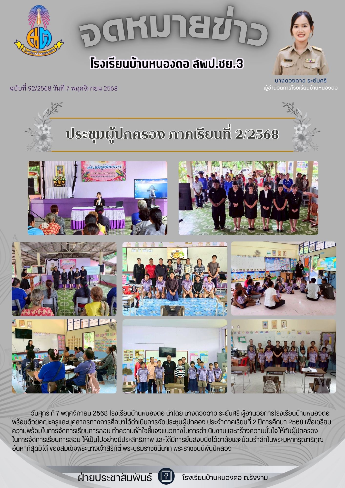 | 3 | วันศุกร์ ที่ 7 พฤศจิกายน 2568 โรงเรียนบ้านหนองตอ นำโดย นางดวงดาว ระยับศรี ผู้อำนวยการโรงเรียนบ้านหนองตอ พร้อมด้วยคณะครูและบุคลากรทางการศึกษาได้ดำเนินการจัดประชุมผู้ปกคอง ประจำภาคเรียนที่ 2 ปีการศึกษา 2568 เพื่อเตรียมความพร้อมในการจัดการเรียนการสอน ทำความเข้าใจชี้แจงแนวทางในการดำเนินงานและสร้างความมั่นใจให้กับผู้ปกครอง ในการจัดการเรียนการสอน ให้เป็นไปอย่างมีประสิทธิภาพ และได้มีการยืนสงบนิ่งไว้อาลัยและน้อมรำลึกในพระมหากรุณาธิคุณ อันหาที่สุดมิได้ ของสมเด็จพระนางเจ้าสิริกิติ์ พระบรมราชชินีนาท พระราชชนนีพันปีหลวง |