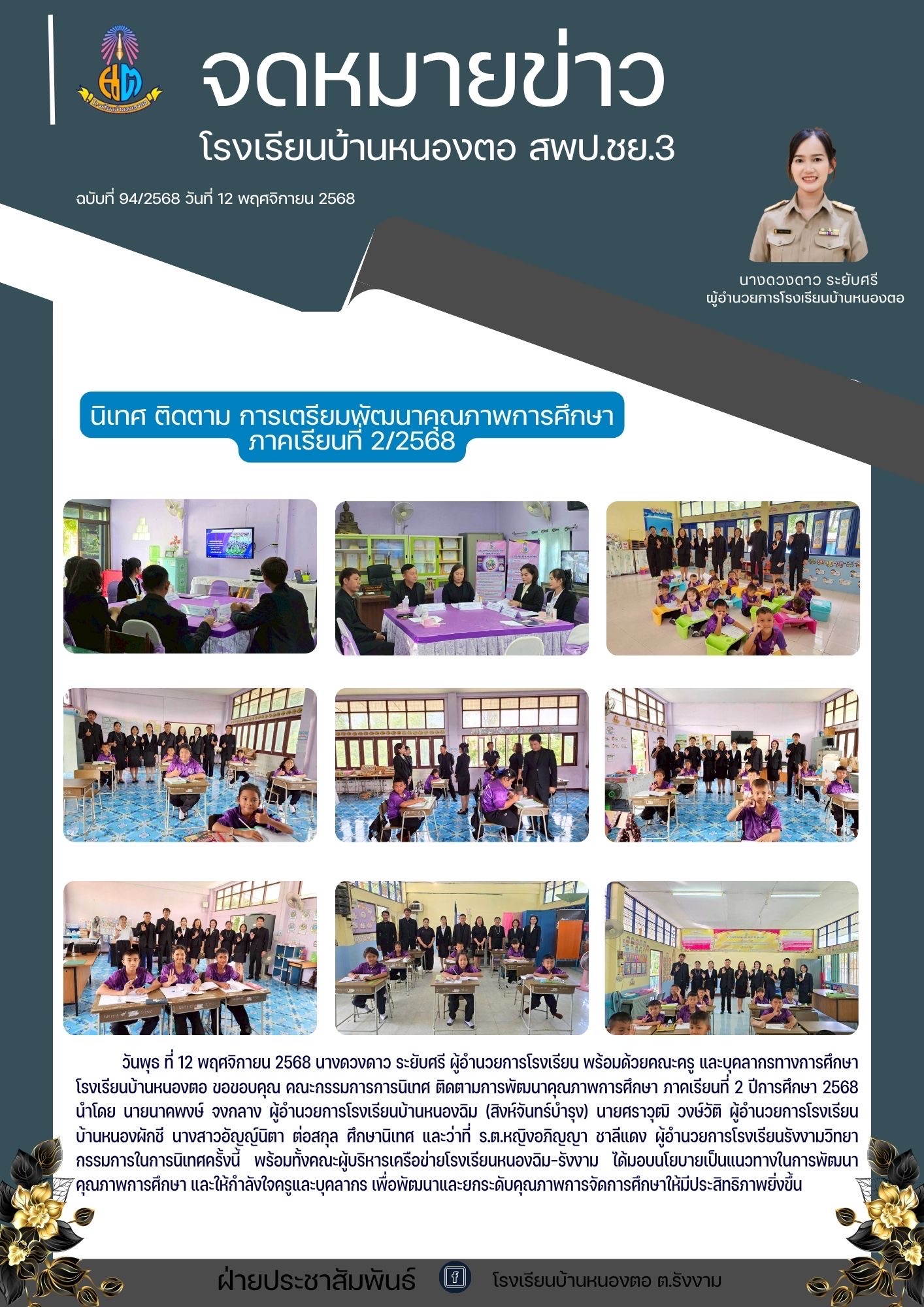 | 4 | วันพุธ ที่ 12 พฤศจิกายน 2568 นางดวงดาว ระยับศรี ผู้อำนวยการโรงเรียน พร้อมด้วยคณะครู และบุคลากรทางการศึกษา โรงเรียนบ้านหนองตอ ขอขอบคุณ คณะกรรมการการนิเทศ ติดตามการพัฒนาคุณภาพการศึกษา ภาคเรียนที่ 2 ปีการศึกษา 2568 นำโดย นายนาคพงษ์ จงกลาง ผู้อำนวยการโรงเรียนบ้านหนองฉิม (สิงห์จันทร์บำรุง) นายศราวุฒิ วงษ์วัติ ผู้อำนวยการโรงเรียนบ้านหนองผักชี นางสาวอัญญ์นิตา ต่อสกุล ศึกษานิเทศ และว่าที่ ร.ต.หญิงอภิญญา ชาลีแดง ผู้อำนวยการโรงเรียนรังงามวิทยา กรรมการในการนิเทศครั้งนี้ พร้อมทั้งคณะผู้บริหารเครือข่ายโรงเรียนหนองฉิม-รังงาม ได้มอบนโยบายเป็นแนวทางในการพัฒนาคุณภาพการศึกษา และให้กำลังใจครูและบุคลากร เพื่อพัฒนาและยกระดับคุณภาพการจัดการศึกษาให้มีประสิทธิภาพยิ่งขึ้น