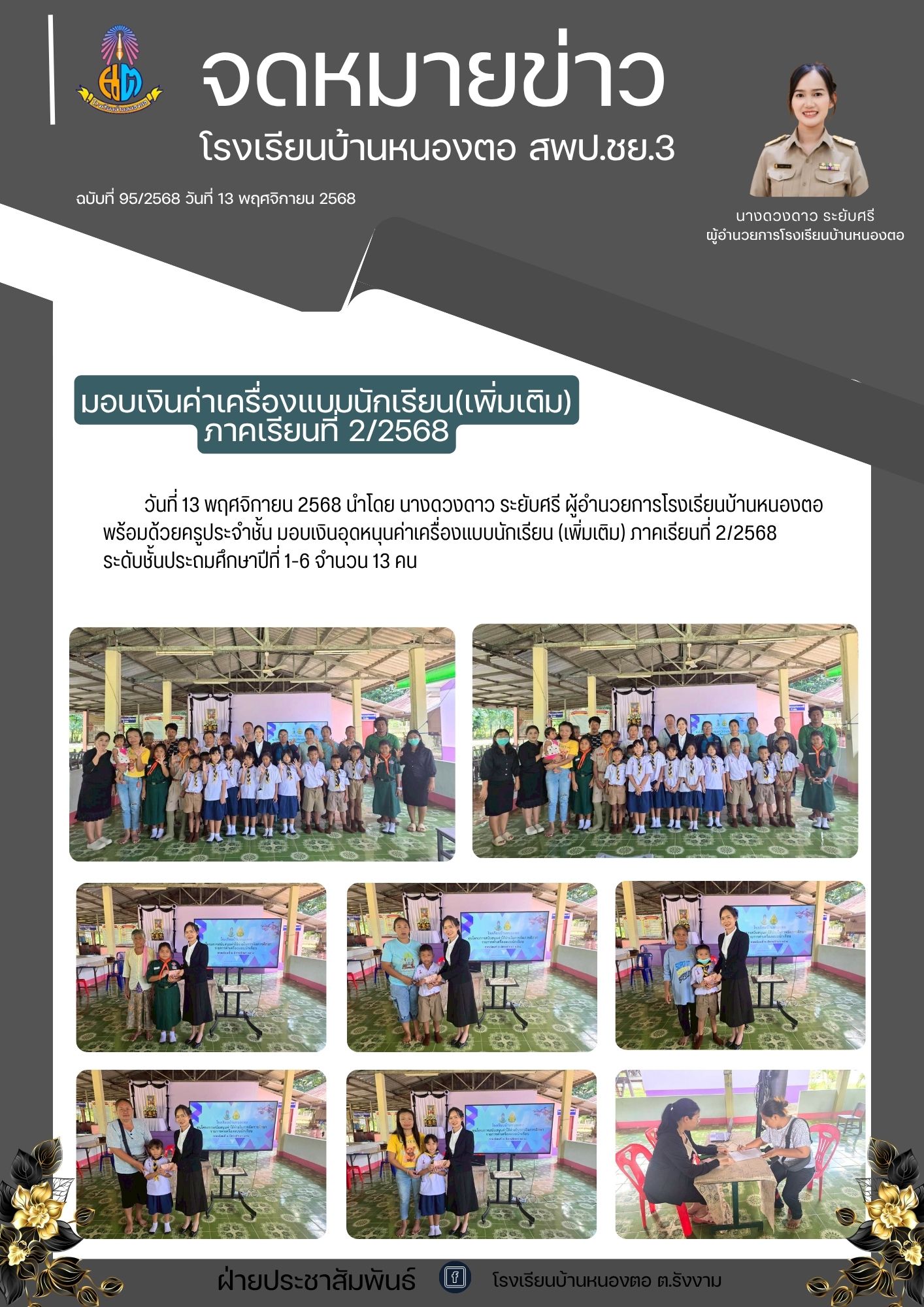 | 5 | วันที่ 13 พฤศจิกายน 2568 นำโดย นางดวงดาว ระยับศรี ผู้อำนวยการโรงเรียนบ้านหนองตอ พร้อมด้วยครูประจำชั้น มอบเงินอุดหนุนค่าเครื่องแบบนักเรียน (เพิ่มเติม) ภาคเรียนที่ 2/2568 ระดับชั้นประถมศึกษาปีที่ 1-6 จำนวน 13 คน |