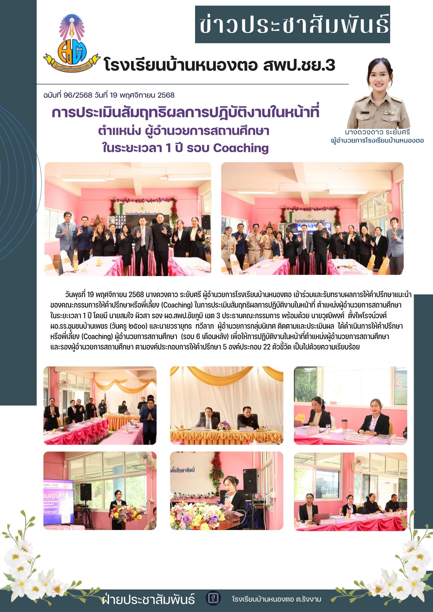 วันพุธที่ 19 พฤศจิกายน 2568 นางดวงดาว ระยับศรี ผู้อำนวยการโรงเรียนบ้านหนองตอ เข้าร่วมและรับทราบผลการให้คำปรึกษาแนะนำของคณะกรรมการให้คำปรึกษาหรือพี่เลี้ยง (Coaching) ในการประเมินสัมฤทธิผลการปฏิบัติงานในหน้าที่ ตำแหน่งผู้อำนวยการสถานศึกษา ในระยะเวลา 1 ปี โดยมี นายสมใจ ผิวสา รอง ผอ.สพป.ชัยภูมิ เขต 3 ประธานคณะกรรมการ พร้อมด้วย นายวุฒิพงศ์ ตั้งไพโรจน์วงศ์ ผอ.รร.ชุมชนบ้านเพชร (วันครู ๒๕๐๐) และนายวรายุทธ ทวีลาภ ผู้อำนวยการกลุ่มนิเทศ ติดตามและประเมินผล ได้ดำเนินการให้คำปรึกษาหรือพี่เลี้ยง (Coaching) ผู้อำนวยการสถานศึกษา (รอบ 6 เดือนหลัง) เพื่อให้การปฏิบัติงานในหน้าที่ตำแหน่งผู้อำนวยการสถานศึกษาและรองผู้อำนวยการสถานศึกษา ตามองค์ประกอบการให้คำปรึกษา 5 องค์ประกอบ 22 ตัวชี้วัด เป็นไปด้วยความเรียบร้อย