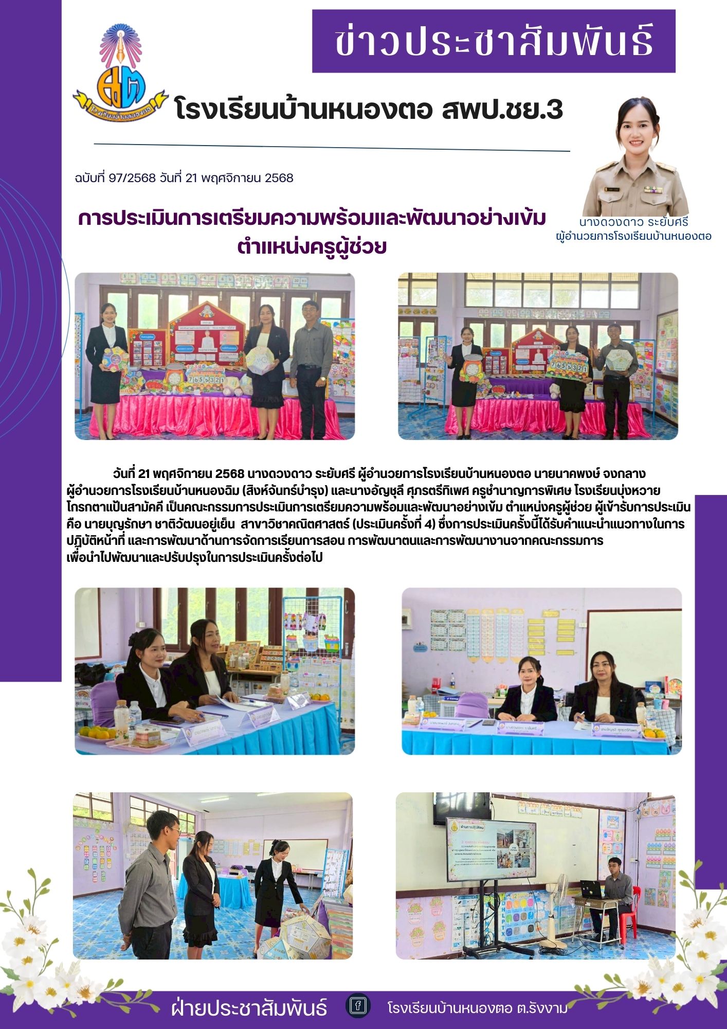| 7 | วันที่ 21 พฤศจิกายน 2568 นางดวงดาว ระยับศรี ผู้อำนวยการโรงเรียนบ้านหนองตอ นายนาคพงษ์ จงกลาง ผู้อำนวยการโรงเรียนบ้านหนองฉิม (สิงห์จันทร์บำรุง) และนางอัญชุลี ศุภรตรีทิเพศ ครูชำนาญการพิเศษ โรงเรียนบุ่งหวาย โกรกตาแป้นสามัคคี เป็นคณะกรรมการประเมินการเตรียมความพร้อมและพัฒนาอย่างเข้ม ตำแหน่งครูผู้ช่วย ผู้เข้ารับการประเมิน คือ นายบุญรักษา ชาติวัฒนอยู่เย็น สาขาวิชาคณิตศาสตร์ (ประเมินครั้งที่ 4) ซึ่งการประเมินครั้งนี้ได้รับคำแนะนำแนวทางในการปฏิบัติหน้าที่ และการพัฒนาด้านการจัดการเรียนการสอน การพัฒนาตนและการพัฒนางานจากคณะกรรมการ เพื่อนำไปพัฒนาและปรับปรุงในการประเมินครั้งต่อไป |
