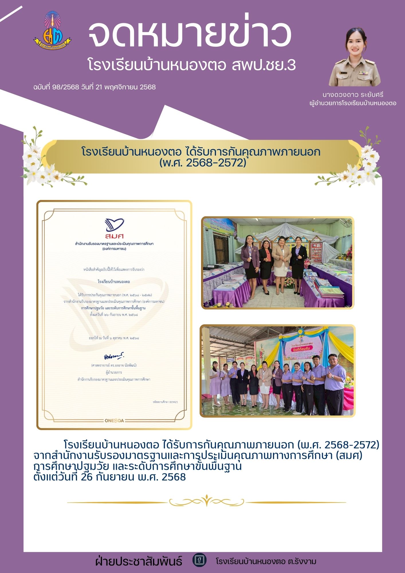 | 8 | โรงเรียนบ้านหนองตอ ได้รับการกันคุณภาพภายนอก (พ.ศ. 2568-2572) จากสำนักงานรับรองมาตรฐานและการประเมินคุณภาพทางการศึกษา (สมศ) การศึกษาปฐมวัย และระดับการศึกษาขั้นพื้นฐาน ตั้งแต่วันที่ 26 กันยายน พ.ศ. 2568 |
