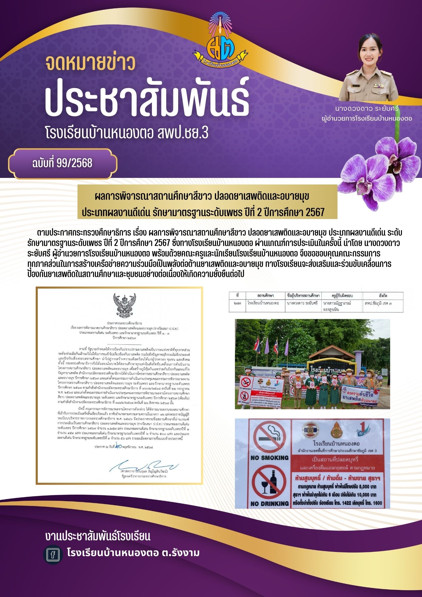 | 9 | ตามประกาศกระทรวงศึกษาธิการ เรื่อง ผลการพิจารณาสถานศึกษาสีขาว ปลอดยาเสพติดและอบายมุข ประเภทผลงานดีเด่น ระดับรักษามาตรฐานระดับเพชร ปีที่ 2 ปีการศึกษา 2567 ซึ่งทางโรงเรียนบ้านหนองตอ ผ่านเกณฑ์การประเมินในครั้งนี้ นำโดย นางดวงดาว ระยับศรี ผู้อำนวยการโรงเรียนบ้านหนองตอ พร้อมด้วยคณะครูและนักเรียนโรงเรียนบ้านหนองตอ จึงขอขอบคุณคณะกรรมการทุกภาคส่วนในการสร้างเครือข่ายความร่วมมือเป็นพลังต่อต้านยาเสพติดและอบายมุข ทางโรงเรียนจะส่งเสริมและร่วมขับเคลื่อนการป้องกันยาเสพติดในสถานศึกษาและชุมชนอย่างต่อเนื่องให้เกิดความยั่งยืนต่อไป |