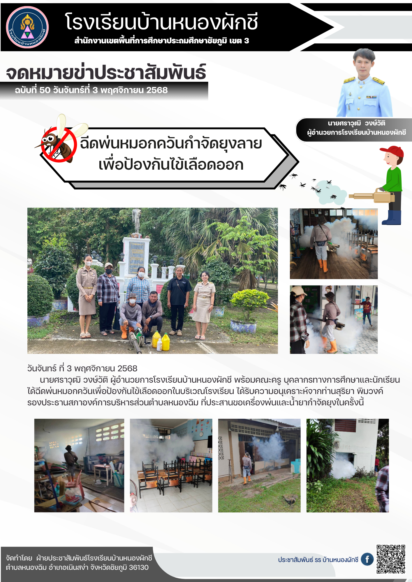 | 1 | วันจันทร์ ที่ 3 พฤศจิกายน 2568 นายศราวุฒิ วงษ์วัติ ผู้อำนวยการโรงเรียนบ้านหนองผักชี พร้อมคณะครู บุคลากรทางการศึกษาและนักเรียน ได้ฉีดพ่นหมอกควันเพื่อป้องกันไข้เลือดออกในบริเวณโรงเรียน ได้รับความอนุเคราะห์จากท่านสุริยา พิมวงค์ รองประธานสภาองค์การบริหารส่วนตำบลหนองฉิม ที่ประสานขอเครื่องพ่นและน้ำยากำจัดยุงในครั้งนี้ |