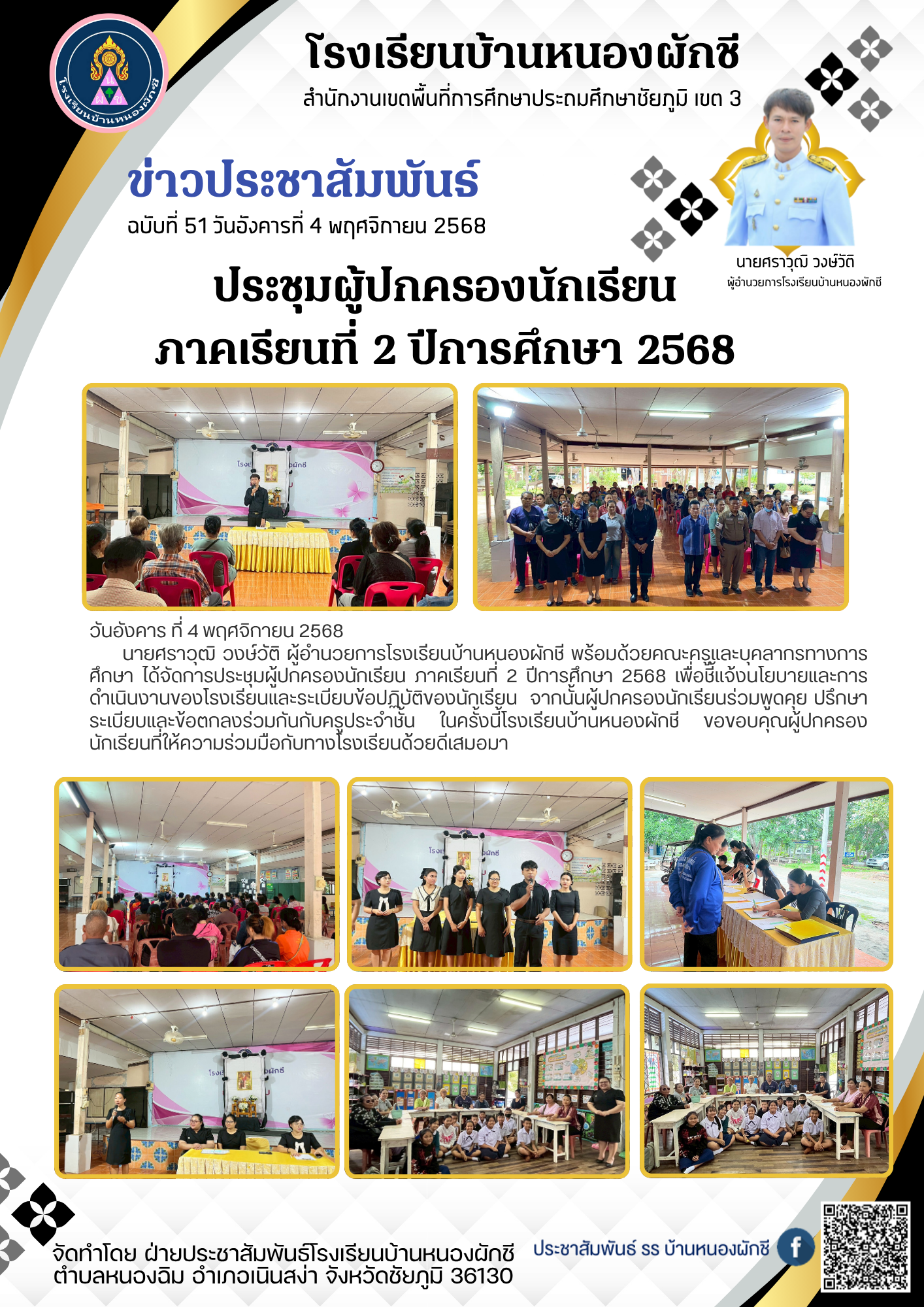 | 2 | วันอังคาร ที่ 4 พฤศจิกายน 2568 นายศราวุฒิ วงษ์วัติ ผู้อำนวยการโรงเรียนบ้านหนองผักชี พร้อมด้วยคณะครูและบุคลากรทางการศึกษา ได้จัดการประชุมผู้ปกครองนักเรียน ภาคเรียนที่ 2 ปีการศึกษา 2568 เพื่อชี้แจ้งนโยบายและการดำเนินงานของโรงเรียนและระเบียบข้อปฏิบัติของนักเรียน จากนั้นผู้ปกครองนักเรียนร่วมพูดคุย ปรึกษาระเบียบและข้อตกลงร่วมกันกับครูประจำชั้น ในครั้งนี้โรงเรียนบ้านหนองผักชี ขอขอบคุณผู้ปกครองนักเรียนที่ให้ความร่วมมือกับทางโรงเรียนด้วยดีเสมอมา |