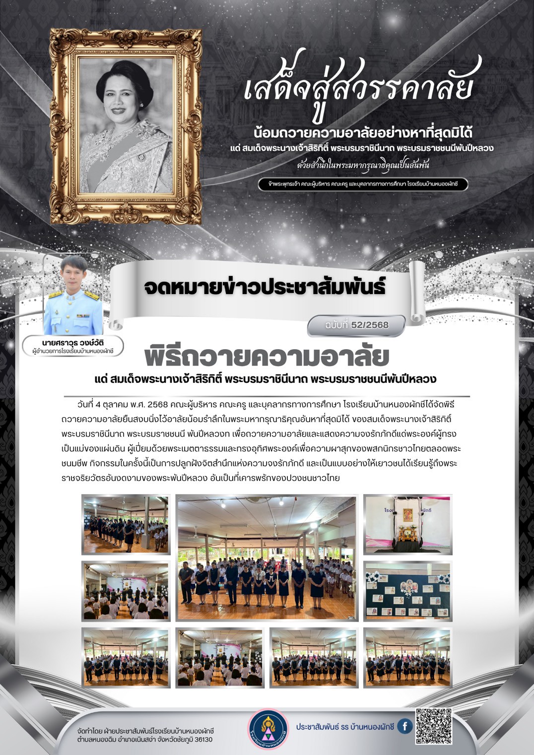 | 3 | วันที่ 4 ตุลาคม พ.ศ. 2568 คณะผู้บริหาร คณะครู และบุคลากรทางการศึกษา โรงเรียนบ้านหนองผักชีได้จัดพิธีถวายความอาลัยยืนสงบนิ่งไว้อาลัยน้อมรำลึกในพระมหากรุณาธิคุณอันหาที่สุดมิได้ ของสมเด็จพระนางเจ้าสิริกิติ์ พระบรมราชินีนาถ พระบรมราชชนนี พันปีหลวงท เพื่อถวายความอาลัยและแสดงความจงรักภักดีแด่พระองค์ผู้ทรงเป็นแม่ของแผ่นดิน ผู้เปี่ยมด้วยพระเมตตาธรรมและทรงอุทิศพระองค์เพื่อความผาสุกของพสกนิกรชาวไทยตลอดพระชนมชีพ กิจกรรมในครั้งนี้เป็นการปลูกฝังจิตสำนึกแห่งความจงรักภักดี และเป็นแบบอย่างให้เยาวชนได้เรียนรู้ถึงพระราชจริยวัตรอันงดงามของพระพันปีหลวง อันเป็นที่เคารพรักของปวงชนชาวไทย