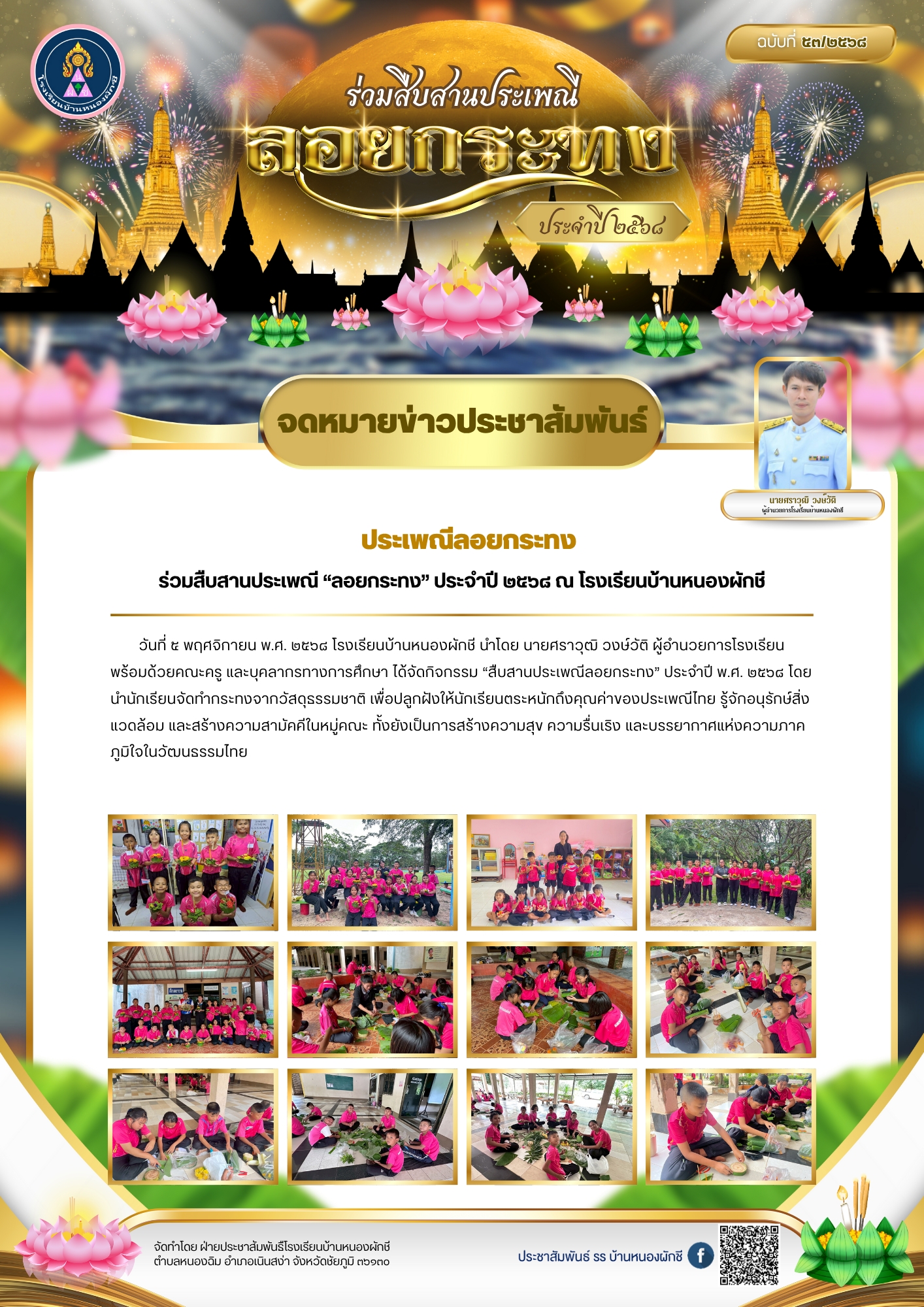 | 4 | วันที่ ๕ พฤศจิกายน พ.ศ. ๒๕๖๘ โรงเรียนบ้านหนองผักชี นำโดย นายศราวุฒิ วงษ์วัติ ผู้อำนวยการโรงเรียนพร้อมด้วยคณะครู และบุคลากรทางการศึกษา ได้จัดกิจกรรม “สืบสานประเพณีลอยกระทง” ประจำปี พ.ศ. ๒๕๖๘ โดยนำนักเรียนจัดทำกระทงจากวัสดุธรรมชาติ เพื่อปลูกฝังให้นักเรียนตระหนักถึงคุณค่าของประเพณีไทย รู้จักอนุรักษ์สิ่งแวดล้อม และสร้างความสามัคคีในหมู่คณะ ทั้งยังเป็นการสร้างความสุข ความรื่นเริง และบรรยากาศแห่งความภาคภูมิใจในวัฒนธรรมไทย