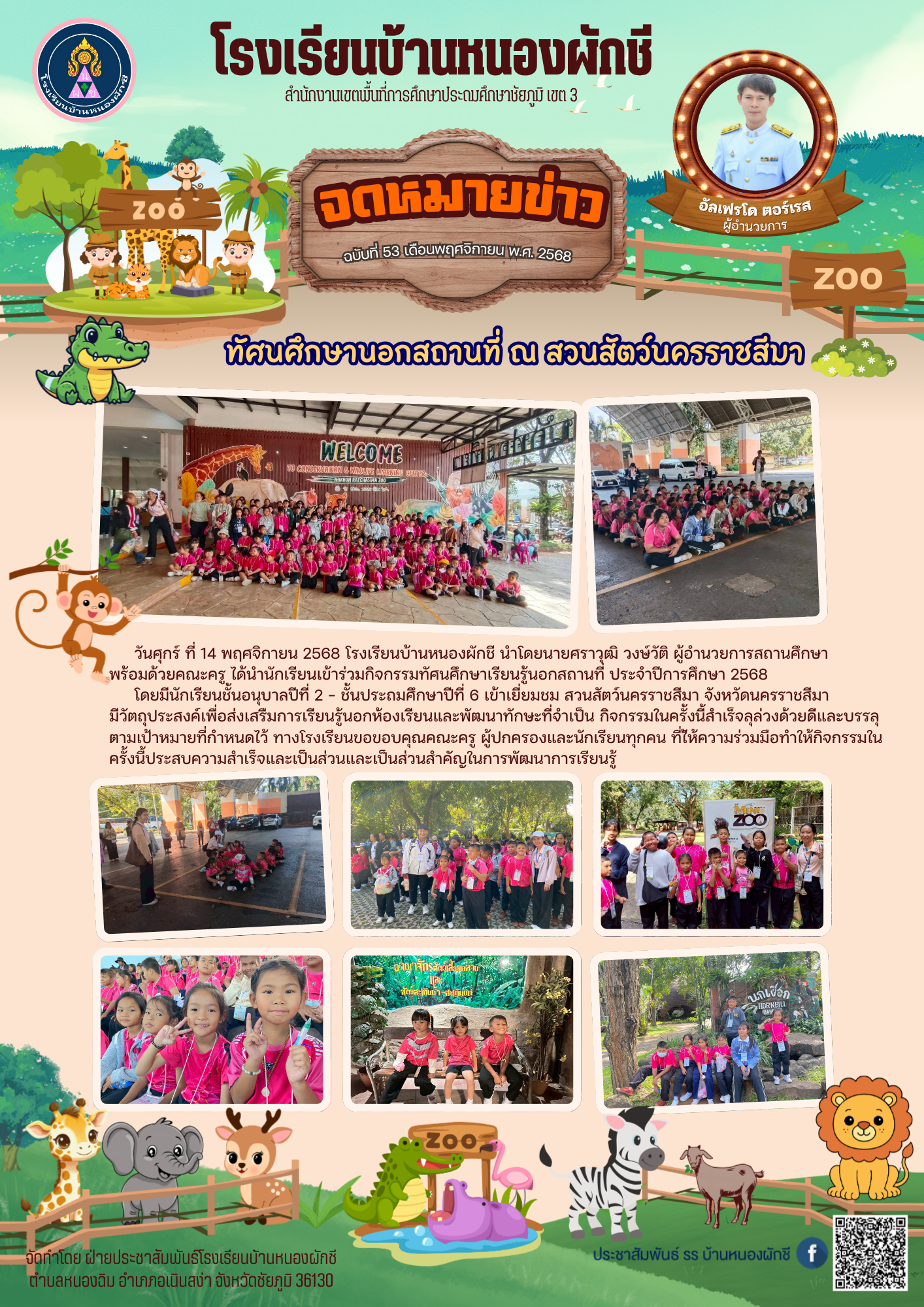 | 6 | วันศุกร์ ที่ 14 พฤศจิกายน 2568 โรงเรียนบ้านหนองผักชี นำโดยนายศราวุฒิ วงษ์วัติ ผู้อำนวยการสถานศึกษาพร้อมด้วยคณะครู ได้นำนักเรียนเข้าร่วมกิจกรรมทัศนศึกษาเรียนรู้นอกสถานที่ ประจำปีการศึกษา 2568 โดยมีนักเรียนชั้นอนุบาลปีที่ 2 - ชั้นประถมศึกษาปีที่ 6 เข้าเยี่ยมชม สวนสัตว์นครราชสีมา จังหวัดนครราชสีมามีวัตถุประสงค์เพื่อส่งเสรืมการเรียนรู้นอกห้องเรียนและพัฒนาทักษะที่จำเป็น กิจกรรมในครั้งนี้สำเร็จลุล่วงด้วยดีและบรรลุตามเป้าหมายที่กำหนดไว้ ทางโรงเรียนขอขอบคุณคณะครู ผู้ปกครองและนักเรียนทุกคน ที่ใ้ห้ความร่วมมือทำให้กิจกรรมในครั้งนี้ประสบความสำเร็จและเป็นส่วนและเป็นส่วนสำคัญในการพัฒนาการเรียนรู้ |